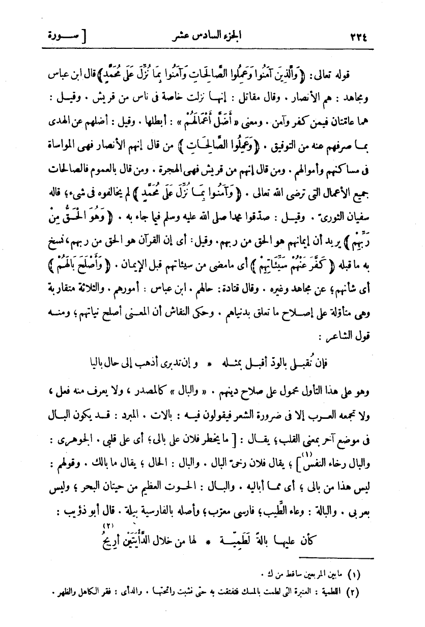 قَوْلُهُ تَعَالَى:" وَالَّذِينَ آمَنُوا وَعَمِلُوا الصَّالِحاتِ وَآمَنُوا بِما نُزِّلَ عَلى مُحَمَّدٍ" قَالَ ابْنُ عَبَّاسٍ وَمُجَاهِدٌ: هُمُ الْأَنْصَارُ. وَقَالَ مُقَاتِلٌ: إِنَّهَا نَزَلَتْ خَاصَّةً فِي نَاسٍ مِنْ قُرَيْشٍ. وَقِيلَ: هُمَا عامتان فيمن كفروا وَآمَنَ. وَمَعْنَى" أَضَلَّ أَعْمالَهُمْ" أَبْطَلَهَا. وَقِيلَ: أَضَلَّهُمْ عَنِ الْهُدَى بِمَا صَرَفَهُمْ عَنْهُ مِنَ التَّوْفِيقِ." وَعَمِلُوا الصَّالِحاتِ" مَنْ قَالَ إِنَّهُمُ الْأَنْصَارُ فَهِيَ الْمُوَاسَاةُ فِي مَسَاكِنِهِمْ وَأَمْوَالِهِمْ. وَمَنْ قَالَ إِنَّهُمْ مِنْ قُرَيْشٍ فَهِيَ الْهِجْرَةُ. وَمَنْ قَالَ بِالْعُمُومِ فَالصَّالِحَاتُ جَمِيعُ الْأَعْمَالِ الَّتِي تُرْضِي اللَّهَ تَعَالَى." وَآمَنُوا بِما نُزِّلَ عَلى مُحَمَّدٍ" لَمْ يُخَالِفُوهُ في شي، قَالَهُ سُفْيَانُ الثَّوْرِيُّ. وَقِيلَ: صَدَّقُوا مُحَمَّدًا صَلَّى اللَّهُ عَلَيْهِ وَسَلَّمَ فِيمَا جَاءَ بِهِ." وَهُوَ الْحَقُّ مِنْ رَبِّهِمْ" يُرِيدُ أَنَّ إِيمَانَهُمْ هُوَ الْحَقُّ مِنْ رَبِّهِمْ. وَقِيلَ: أَيْ إِنَّ الْقُرْآنَ هُوَ الْحَقُّ مِنْ رَبِّهِمْ، نَسَخَ بِهِ مَا قَبْلَهُ" كَفَّرَ عَنْهُمْ سَيِّئاتِهِمْ" أَيْ مَا مَضَى مِنْ سَيِّئَاتِهِمْ قَبْلَ الْإِيمَانِ." وَأَصْلَحَ بالَهُمْ" أَيْ شَأْنَهُمْ، عَنْ مُجَاهِدٍ وَغَيْرِهِ. وَقَالَ قَتَادَةُ: حَالُهُمْ. ابْنُ عَبَّاسٍ: أُمُورُهُمْ. وَالثَّلَاثَةُ مُتَقَارِبَةٌ وَهِيَ مُتَأَوَّلَةٌ عَلَى إِصْلَاحِ مَا تَعَلَّقَ بِدُنْيَاهُمْ. وَحَكَى النَّقَّاشُ أَنَّ الْمَعْنَى أَصْلَحَ نِيَّاتِهِمْ، وَمِنْهُ قَوْلُ الشَّاعِرِ: