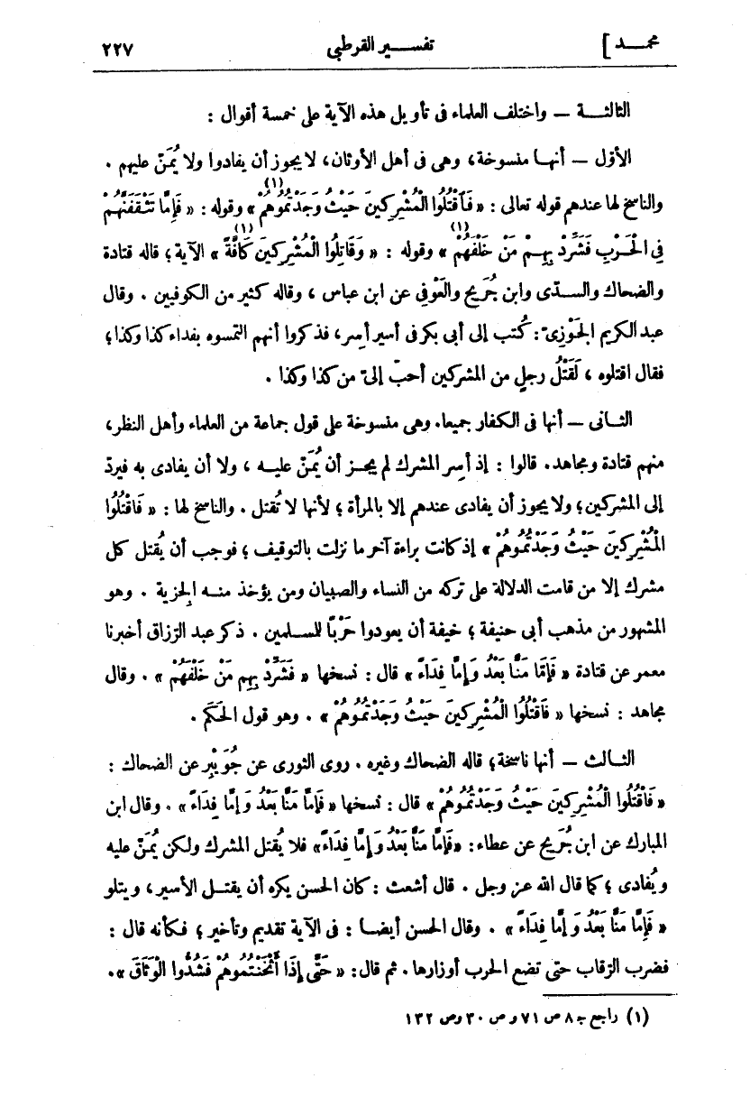 الثَّالِثَةُ- وَاخْتَلَفَ الْعُلَمَاءُ فِي تَأْوِيلِ هَذِهِ الْآيَةِ عَلَى خَمْسَةِ أَقْوَالٍ: الْأَوَّلِ- أَنَّهَا مَنْسُوخَةٌ، وَهِيَ فِي أَهْلِ الْأَوْثَانِ، لَا يَجُوزُ أَنْ يُفَادُوا وَلَا يُمَنُّ عَلَيْهِمْ. وَالنَّاسِخُ لَهَا عِنْدَهُمْ قَوْلُهُ تعالى:" فَاقْتُلُوا الْمُشْرِكِينَ حَيْثُ وَجَدْتُمُوهُمْ" «١» [التوبة: ٥] وَقَوْلُهُ:" فَإِمَّا تَثْقَفَنَّهُمْ فِي الْحَرْبِ فَشَرِّدْ بِهِمْ مَنْ خَلْفَهُمْ" «٢» [الأنفال: ٥٧] وقوله:" وَقاتِلُوا الْمُشْرِكِينَ كَافَّةً" «٣» [التوبة: ٣٦] الآية، قاله قَتَادَةُ وَالضَّحَّاكُ وَالسُّدِّيُّ وَابْنُ جُرَيْجٍ وَالْعَوْفِيُّ عَنِ ابْنِ عَبَّاسٍ، وَقَالَهُ كَثِيرٌ مِنَ الْكُوفِيِّينَ. وَقَالَ عَبْدُ الْكَرِيمِ الْجَوْزِيُّ: كُتِبَ إِلَى أَبِي بَكْرٍ فِي أَسِيرٍ أُسِرَ، فَذَكَرُوا أَنَّهُمُ الْتَمَسُوهُ بِفِدَاءِ كَذَا وَكَذَا، فَقَالَ: اقْتُلُوهُ، لَقَتْلُ رَجُلٍ مِنَ الْمُشْرِكِينَ أَحَبُّ إِلَيَّ مِنْ كَذَا وَكَذَا. الثَّانِي- أَنَّهَا فِي الْكُفَّارِ جَمِيعًا. وَهِيَ مَنْسُوخَةٌ عَلَى قَوْلِ جَمَاعَةٍ مِنَ الْعُلَمَاءِ وَأَهْلِ النَّظَرِ، مِنْهُمْ قتادة ومجاهد. قالوا: إذ أُسِرَ الْمُشْرِكُ لَمْ يَجُزْ أَنْ يُمَنَّ عَلَيْهِ، وَلَا أَنْ يُفَادَى بِهِ فَيُرَدُّ إِلَى الْمُشْرِكِينَ، وَلَا يَجُوزُ أَنْ يُفَادَى عِنْدَهُمْ إِلَّا بِالْمَرْأَةِ، لِأَنَّهَا لَا تُقْتَلُ. وَالنَّاسِخُ لَهَا" فَاقْتُلُوا الْمُشْرِكِينَ حَيْثُ وَجَدْتُمُوهُمْ" [التوبة: ٥] إِذْ كَانَتْ بَرَاءَةٌ آخِرُ مَا نَزَلَتْ بِالتَّوْقِيفِ، فَوَجَبَ أَنْ يُقْتَلُ كُلُّ مُشْرِكٍ إِلَّا مَنْ قَامَتِ الدَّلَالَةُ عَلَى تَرْكِهِ مِنَ النِّسَاءِ وَالصِّبْيَانِ وَمَنْ يُؤْخَذُ مِنْهُ الْجِزْيَةُ. وَهُوَ الْمَشْهُورُ مِنْ مَذْهَبِ أَبِي حَنِيفَةَ، خِيفَةَ أَنْ يَعُودُوا حَرْبًا لِلْمُسْلِمِينَ. ذَكَرَ عَبْدُ الرَّزَّاقِ أَخْبَرَنَا مَعْمَرٌ عَنْ قَتَادَةَ" فَإِمَّا مَنًّا بَعْدُ وَإِمَّا فِداءً" قَالَ نَسَخَهَا" فَشَرِّدْ بِهِمْ مَنْ خَلْفَهُمْ". وَقَالَ مُجَاهِدٌ: نسخها" فَاقْتُلُوا الْمُشْرِكِينَ حَيْثُ وَجَدْتُمُوهُمْ" [التوبة: ٥]. وهو قول الحكم. الثالث- أنها ناسخة، قاله الضَّحَّاكُ وَغَيْرُهُ. رَوَى الثَّوْرِيُّ عَنْ جُوَيْبِرٍ عَنِ الضحاك" فَاقْتُلُوا الْمُشْرِكِينَ حَيْثُ وَجَدْتُمُوهُمْ" [التوبة: ٥] قَالَ نَسَخَهَا" فَإِمَّا مَنًّا بَعْدُ وَإِمَّا فِداءً". وَقَالَ ابْنُ الْمُبَارَكِ عَنِ ابْنِ جُرَيْجٍ عَنْ عَطَاءٍ" فَإِمَّا مَنًّا بَعْدُ وَإِمَّا فِداءً" فَلَا يُقْتَلُ الْمُشْرِكُ وَلَكِنْ يُمَنَّ عَلَيْهِ وَيُفَادَى، كَمَا قال الله عز وجل. قال أَشْعَثُ: كَانَ الْحَسَنُ يَكْرَهُ أَنْ يُقْتَلَ الْأَسِيرُ، وَيَتْلُو" فَإِمَّا مَنًّا بَعْدُ وَإِمَّا فِداءً". وَقَالَ الْحَسَنُ أَيْضًا: فِي الْآيَةِ تَقْدِيمٌ وَتَأْخِيرٌ، فَكَأَنَّهُ قَالَ: فَضَرْبُ الرِّقَابِ حَتَّى تَضَعَ الْحَرْبُ أَوْزَارَهَا. ثُمَّ قَالَ:" حَتَّى إِذا أَثْخَنْتُمُوهُمْ فَشُدُّوا الْوَثاقَ".