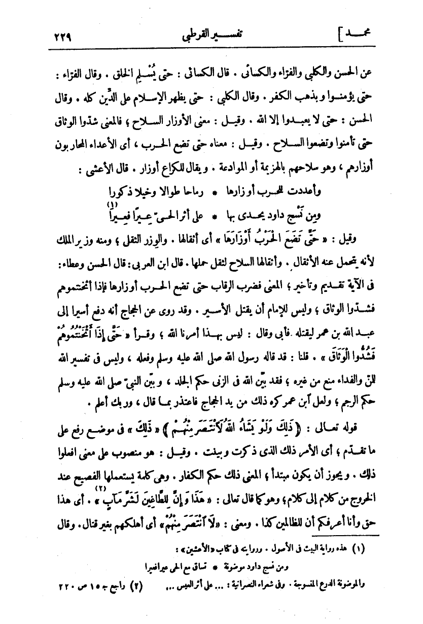 عَنِ الْحَسَنِ وَالْكَلْبِيِّ وَالْفَرَّاءِ وَالْكِسَائِيِّ. قَالَ الْكِسَائِيُّ: حَتَّى يُسْلِمَ الْخَلْقُ. وَقَالَ الْفَرَّاءُ: حَتَّى يُؤْمِنُوا وَيَذْهَبَ الْكُفْرُ. وَقَالَ الْكَلْبِيُّ: حَتَّى يَظْهَرَ الْإِسْلَامُ عَلَى الدِّينِ كُلِّهِ. وَقَالَ الْحَسَنُ: حَتَّى لَا يَعْبُدُوا إِلَّا اللَّهَ. وَقِيلَ: مَعْنَى الْأَوْزَارِ السِّلَاحُ، فَالْمَعْنَى شُدُّوا الْوَثَاقَ حَتَّى تَأْمَنُوا وَتَضَعُوا السِّلَاحَ. وَقِيلَ: مَعْنَاهُ حَتَّى تَضَعَ الْحَرْبُ، أَيِ الْأَعْدَاءُ الْمُحَارَبُونَ أَوْزَارَهُمْ، وَهُوَ سِلَاحُهُمْ بِالْهَزِيمَةِ أَوِ الْمُوَادَعَةِ. وَيُقَالُ لِلْكُرَاعِ أَوْزَارٌ. قَالَ الْأَعْشَى: