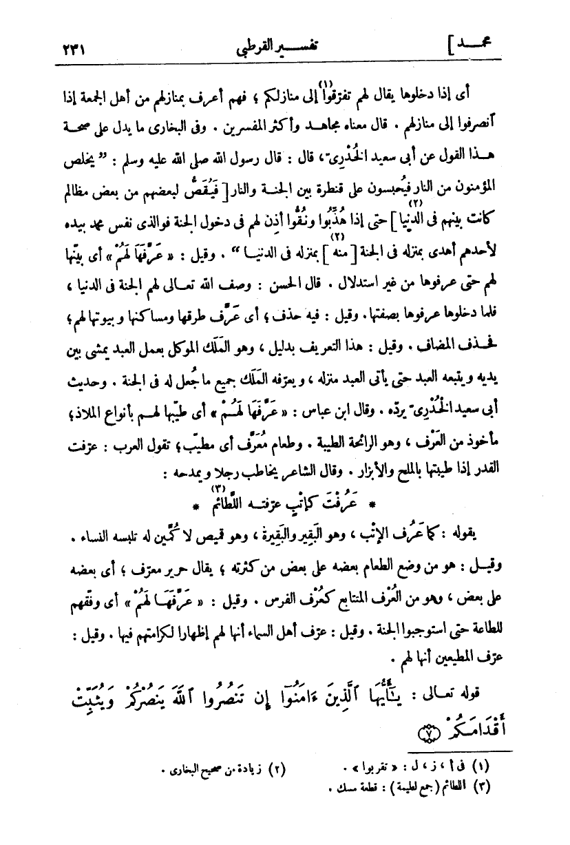 أَيْ إِذَا دَخَلُوهَا يُقَالُ لَهُمْ تَفَرَّقُوا «١» إِلَى مَنَازِلِكُمْ، فَهُمْ أَعْرَفُ بِمَنَازِلِهِمْ مِنْ أَهْلِ الْجُمُعَةِ إِذَا انْصَرَفُوا إِلَى مَنَازِلِهِمْ. قَالَ مَعْنَاهُ مُجَاهِدٌ وَأَكْثَرُ الْمُفَسِّرِينَ. وَفِي الْبُخَارِيِّ مَا يَدُلُّ عَلَى صِحَّةِ هَذَا الْقَوْلِ عَنْ أَبِي سَعِيدٍ الْخُدْرِيِّ، قَالَ قَالَ رَسُولُ اللَّهِ صَلَّى اللَّهُ عَلَيْهِ وَسَلَّمَ: (يَخْلُصُ الْمُؤْمِنُونَ مِنَ النَّارِ فَيُحْبَسُونَ عَلَى قَنْطَرَةٍ بَيْنَ الْجَنَّةِ وَالنَّارِ] فَيُقَصُّ لِبَعْضِهِمْ مِنْ بعض مظالم [كانت بينهم في الدنيا «٢» [حتى إِذَا هُذِّبُوا وَنُقُّوا أُذِنَ لَهُمْ فِي دُخُولِ الْجَنَّةِ فَوَالَّذِي نَفْسُ مُحَمَّدٍ بِيَدِهِ لَأَحَدُهُمْ أَهْدَى بِمَنْزِلِهِ فِي الْجَنَّةِ] مِنْهُ «٣» [بِمَنْزِلِهِ فِي الدُّنْيَا (. وَقِيلَ:" عَرَّفَها لَهُمْ" أَيْ بَيَّنَهَا لَهُمْ حَتَّى عَرَفُوهَا مِنْ غَيْرِ اسْتِدْلَالٍ. قَالَ الْحَسَنُ: وَصَفَ اللَّهُ تَعَالَى لَهُمُ الْجَنَّةَ فِي الدُّنْيَا، فَلَمَّا دَخَلُوهَا عَرَفُوهَا بِصِفَتِهَا. وَقِيلَ: فِيهِ حَذْفٌ، أَيْ عَرَّفَ طُرُقَهَا وَمَسَاكِنَهَا وَبُيُوتَهَا لَهُمْ، فَحَذَفَ الْمُضَافَ. وَقِيلَ: هَذَا التَّعْرِيفُ بِدَلِيلٍ، وَهُوَ الْمَلَكُ الْمُوَكَّلُ بِعَمَلِ الْعَبْدِ يَمْشِي بَيْنَ يَدَيْهِ وَيَتْبَعُهُ الْعَبْدُ حَتَّى يَأْتِيَ الْعَبْدُ مَنْزِلَهُ، وَيُعَرِّفَهُ الْمَلَكُ جَمِيعَ مَا جُعِلَ لَهُ فِي الْجَنَّةِ. وَحَدِيثُ أَبِي سَعِيدٍ الْخُدْرِيِّ يَرُدُّهُ. وَقَالَ ابْنُ عَبَّاسٍ" عَرَّفَها لَهُمْ" أَيْ طَيَّبَهَا لَهُمْ بِأَنْوَاعِ الْمَلَاذِ، مَأْخُوذٌ مِنَ الْعَرْفِ، وَهُوَ الرَّائِحَةُ الطَّيِّبَةُ. وَطَعَامٌ مُعَرَّفٌ أَيْ مُطَيَّبٌ، تَقُولُ الْعَرَبُ: عَرَّفْتَ الْقِدْرَ إِذَا طَيَّبْتَهَا بِالْمِلْحِ وَالْأَبْزَارِ. وَقَالَ الشَّاعِرُ يُخَاطِبُ رَجُلًا ويمدحه: