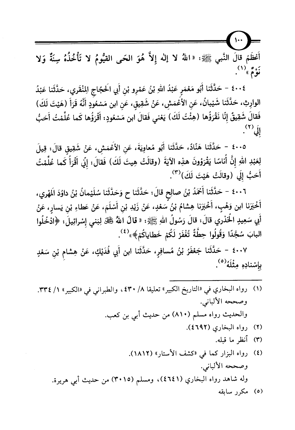 4004 - حَدَّثَنا أَبُو مَعْمَرٍ عَبْدُ اللَّهِ بْنُ عَمْرِو بْنِ أَبي الحَجّاجِ المِنْقَري، حَدَّثَنا عَبْدُ الوارِثِ، حَدَّثَنا شَيْبانُ، عَنِ الأَعْمَشِ، عَنْ شَقِيقٍ، عَنِ ابن مَسْعُودٍ أَنَّهُ قَرَأَ (هَيْتَ لَكَ) فَقالَ شَقِيقٌ إِنّا نَقْرَؤها (هِيْتُ لَكَ) يَعْني فَقالَ ابن مَسْعُودٍ: أَقْرَؤُها كَما عُلِّمْت أَحَبُّ إِلَي (¬2).