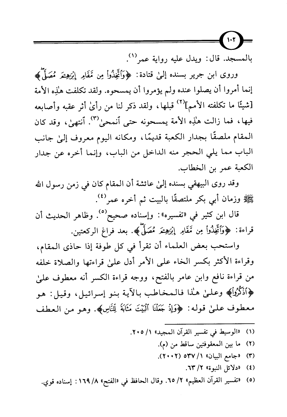 وقد روى البيهقي بسنده إلى عائشة أن المقام كان في زمن رسول اللَّه -صلى اللَّه عليه وسلم- وزمان أبي بكر ملتصقًا بالبيت ثم أخره عمر (¬4).