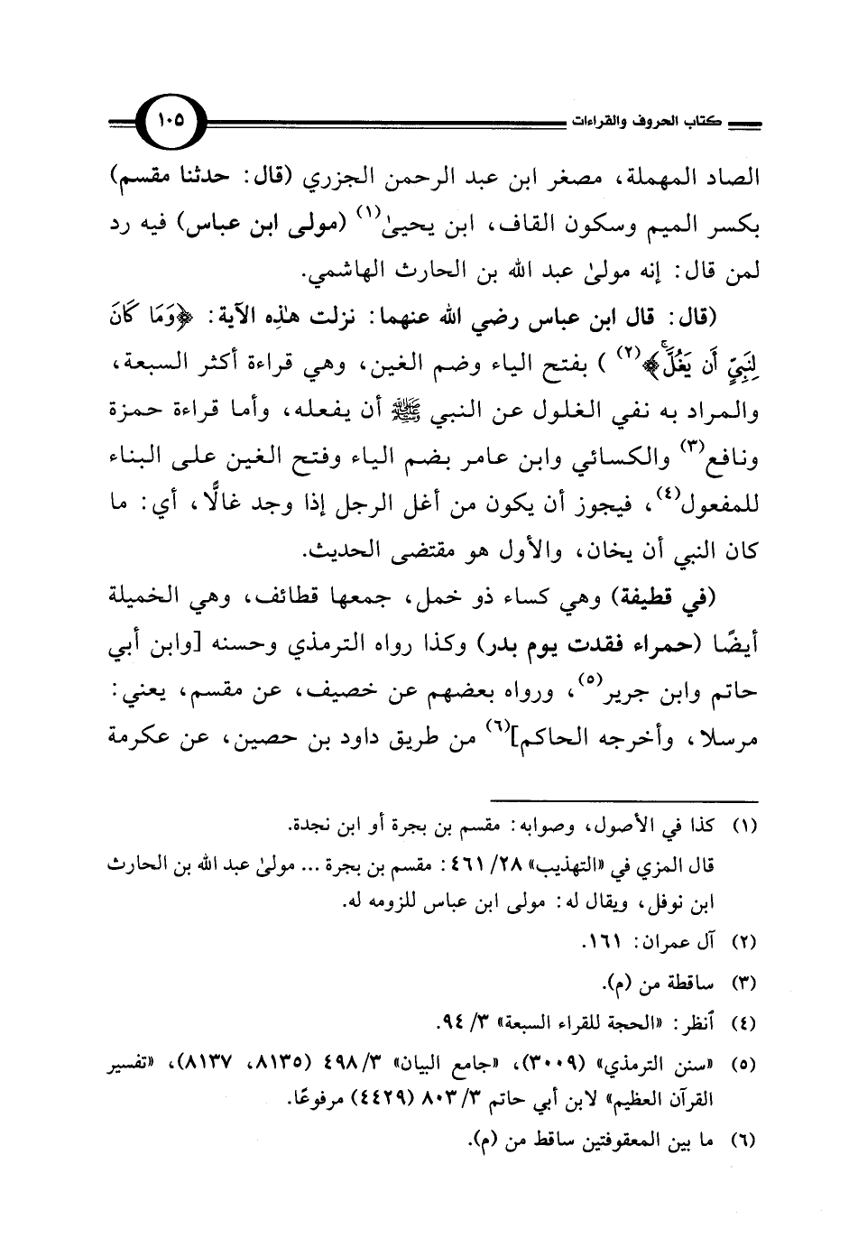 (قال: قال ابن عباس رضي اللَّه عنهما: نزلت هذِه الآية: {وَمَا كَانَ لِنَبِيٍّ أَنْ يَغُلَّ}) (¬2) بفتح الياء وضم الغين، وهي قراءة أكثر السبعة، والمراد به نفي الغلول عن النبي -صلى اللَّه عليه وسلم- أن يفعله، وأما قراءة حمزة ونافع (¬3) والكسائي وابن عامر بضم الياء وفتح الغين على البناء للمفعول (¬4)، فيجوز أن يكون من أغل الرجل إذا وجد غالًّا، أي: ما كان النبي أن يخان، والأول هو مقتضى الحديث.