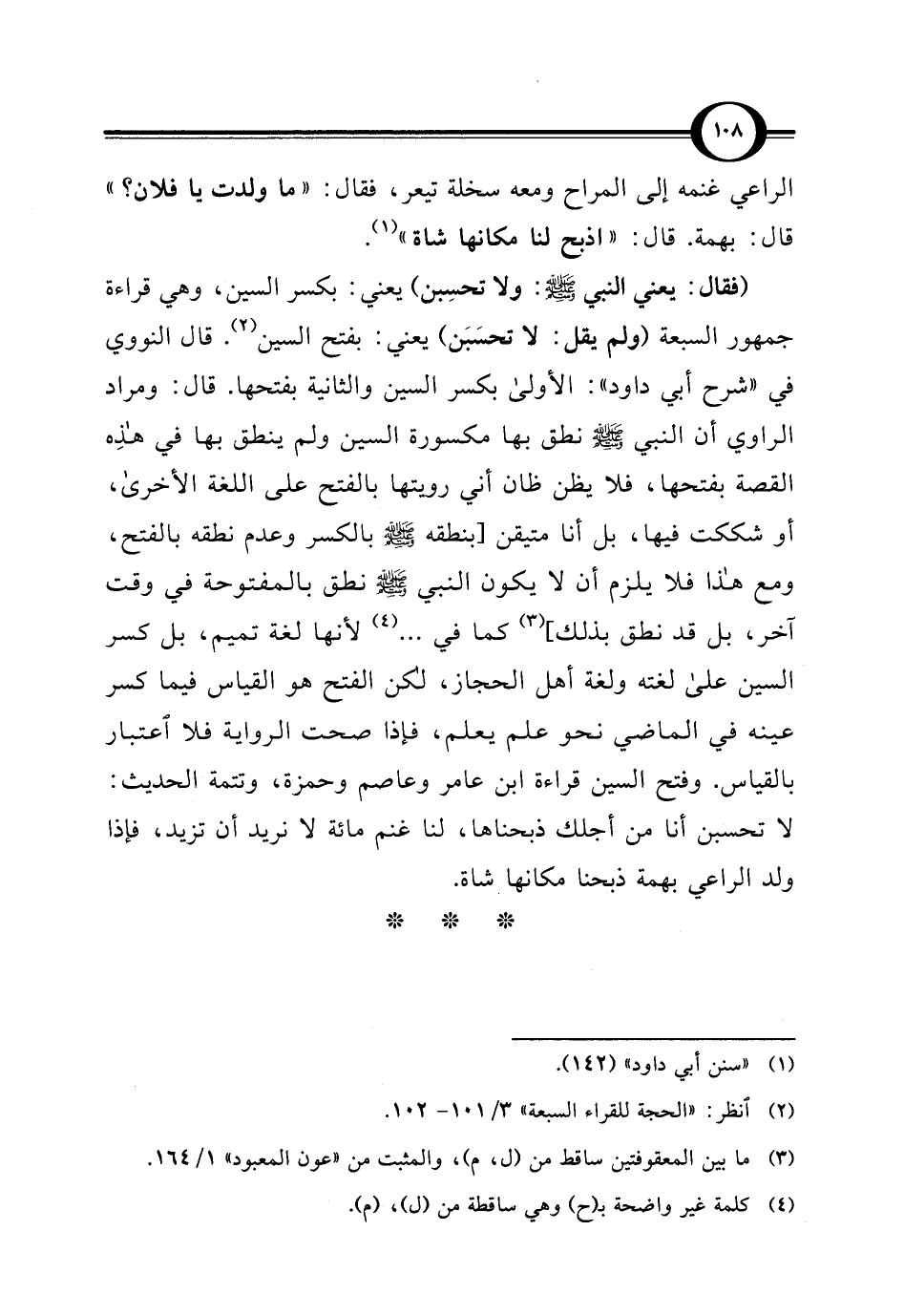 (فقال: يعني النبي -صلى اللَّه عليه وسلم-: ولا تحسِبن) يعني: بكسر السين، وهي قراءة جمهور السبعة (ولم يقل: لا تحسَبَن) يعني: بفتح السين (¬2). قال النووي في "شرح أبي داود": الأولى بكسر السين والثانية بفتحها. قال: ومراد الراوي أن النبي -صلى اللَّه عليه وسلم- نطق بها مكسورة السين ولم ينطق بها في هذِه القصة بفتحها، فلا يظن ظان أني رويتها بالفتح على اللغة الأخرى، أو شككت فيها، بل أنا متيقن [بنطقه -صلى اللَّه عليه وسلم- بالكسر وعدم نطقه بالفتح، ومع هذا فلا يلزم أن لا يكون النبي -صلى اللَّه عليه وسلم- نطق بالمفتوحة في وقت آخر، بل قد نطق بذلك] (¬3) كما في. . . (¬4) لأنها لغة تميم، بل كسر السين على لغته ولغة أهل الحجاز، لكن الفتح هو القياس فيما كسر عينه في الماضي نحو علم يعلم، فإذا صحت الرواية فلا اعتبار بالقياس. وفتح السين قراءة ابن عامر وعاصم وحمزة، وتتمة الحديث: لا تحسبن أنا من أجلك ذبحناها، لنا غنم مائة لا نريد أن تزيد، فإذا ولد الراعي بهمة ذبحنا مكانها شاة.