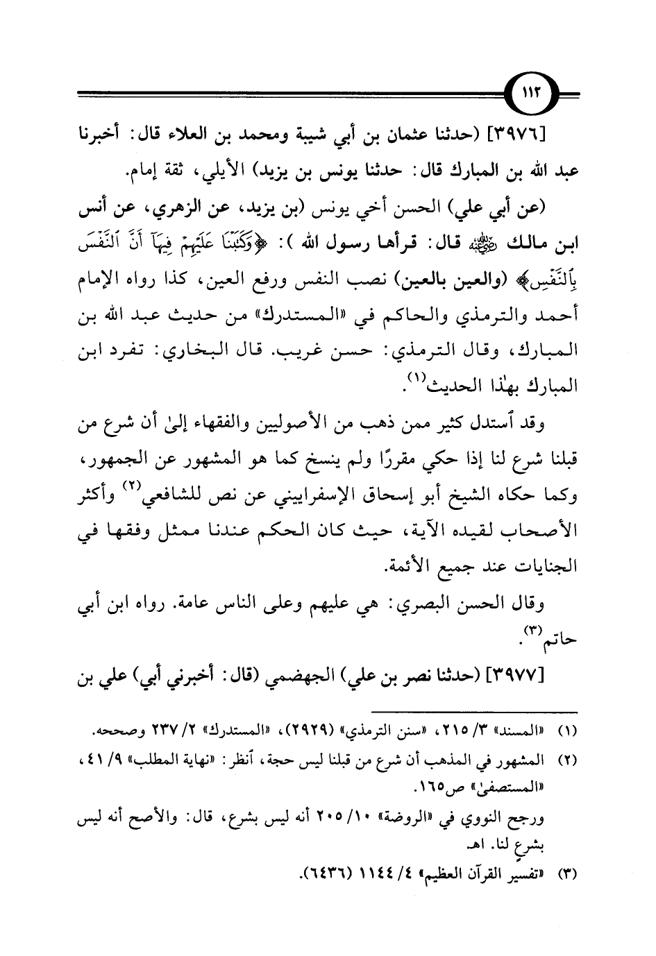 وقد استدل كثير ممن ذهب من الأصوليين والفقهاء إلى أن شرع من قبلنا شرع لنا إذا حكي مقررًا ولم ينسخ كما هو المشهور عن الجمهور، وكما حكاه الشيخ أبو إسحاق الإسفراييني عن نص للشافعي (¬2) وأكثر الأصحاب لقيده الآية، حيث كان الحكم عندنا ممثل وفقها في الجنايات عند جميع الأئمة.
