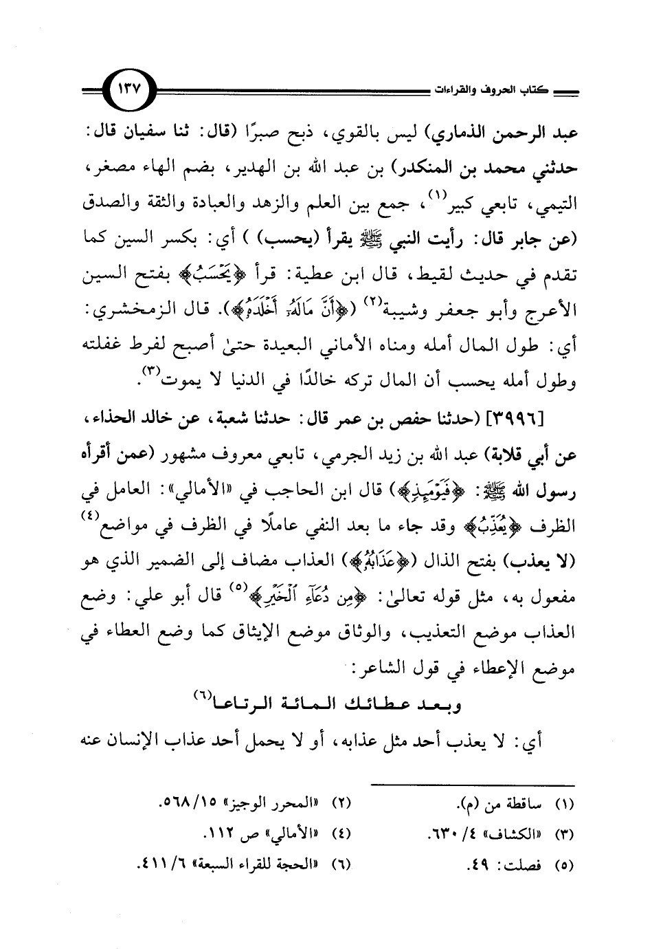 عبد الرحمن الذماري) ليس بالقوي، ذبح صبرًا (قال: ثنا سفيان قال: حدثني محمد بن المنكدر) بن عبد اللَّه بن الهدير، بضم الهاء مصغر، التيمي، تابعي كبير (¬1)، جمع بين العلم والزهد والعبادة والثقة والصدق (عن جابر قال: رأيت النبي -صلى اللَّه عليه وسلم- يقرأ (يحسب)) أي: بكسر السين كما تقدم في حديث لقيط، قال ابن عطية: قرأ {يَحْسَبُ} بفتح السين الأعرج وأبو جعفر وشيبة (¬2) ({أَنَّ مَالَهُ أَخْلَدَهُ}). قال الزمخشري: أي: طول المال أمله ومناه الأماني البعيدة حتى أصبح لفرط غفلته وطول أمله يحسب أن المال تركه خالدًا في الدنيا لا يموت (¬3).