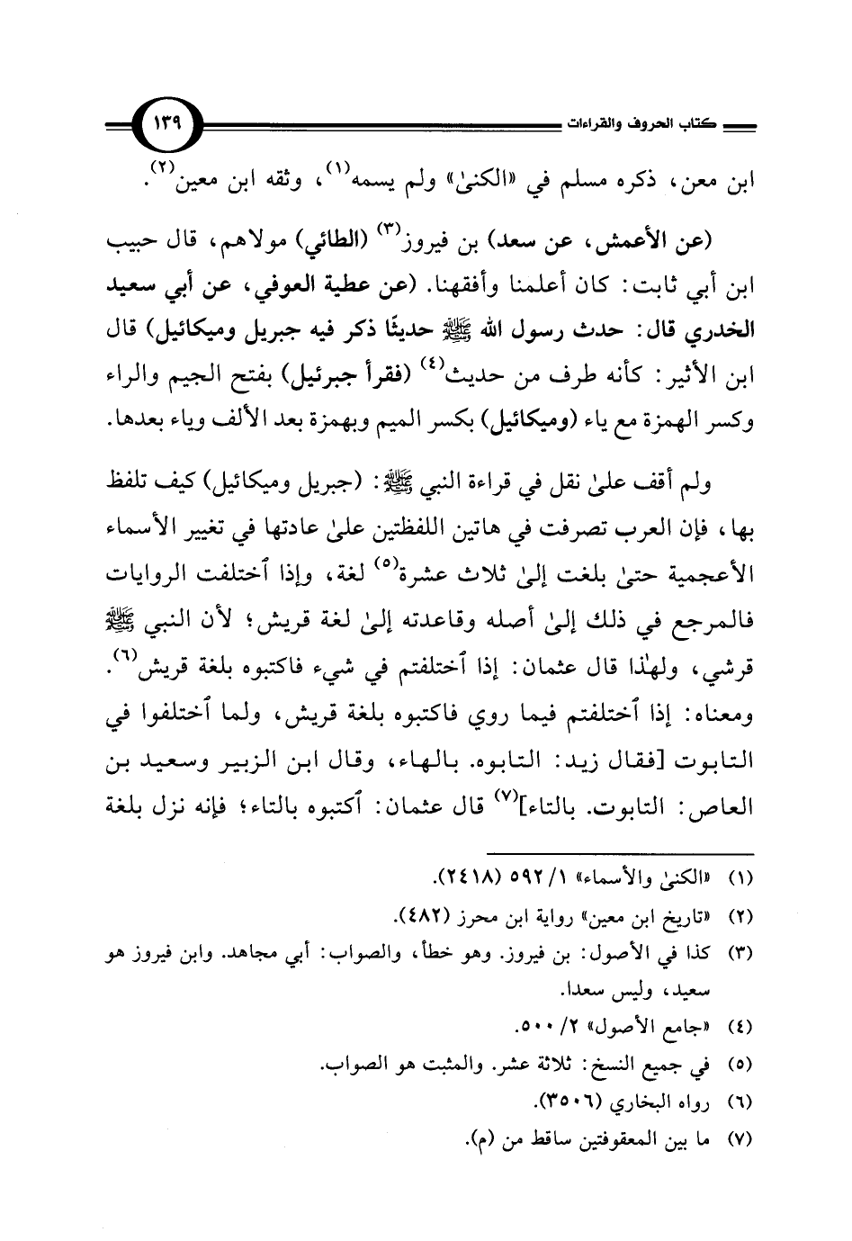 ولم أقف على نقل في قراءة النبي -صلى اللَّه عليه وسلم-: (جبريل وميكائيل) كيف تلفظ بها، فإن العرب تصرفت في هاتين اللفظتين على عادتها في تغيير الأسماء الأعجمية حتى بلغت إلى ثلاث عشرة (¬5) لغة، وإذا اختلفت الروايات فالمرجع في ذلك إلى أصله وقاعدته إلى لغة قريش؛ لأن النبي -صلى اللَّه عليه وسلم- قرشي، ولهذا قال عثمان: إذا اختلفتم في شيء فاكتبوه بلغة قريش (¬6). ومعناه: إذا اختلفتم فيما روي فاكتبوه بلغة قريش، ولما اختلفوا في التابوت [فقال زيد: التابوه. بالهاء، وقال ابن الزبير وسعيد بن العاص: التابوت. بالتاء] (¬7) قال عثمان: اكتبوه بالتاء؛ فإنه نزل بلغة