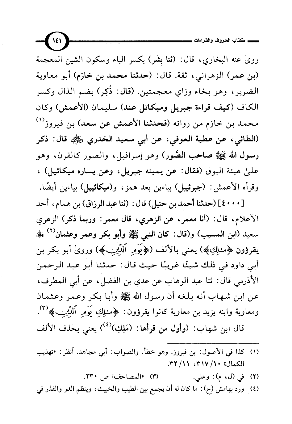 [4000] (حدثنا أحمد بن حنبل) قال: (ثنا عبد الرزاق) بن همام، أحد الأعلام، قال: (أنا معمر، عن الزهري، قال معمر: وربما ذكر) الزهري سعيد (ابن المسيب) و (قال: كان النبي -صلى اللَّه عليه وسلم- وأبو بكر وعمر وعثمان (¬2) -رضي اللَّه عنهم- يقرؤون {مَالِكِ}) يعني بالألف ({يَوْمِ الدِّينِ}) وروى أبو بكر بن أبي داود في ذلك شيئًا غريبًا حيث قال: حدثنا أبو عبد الرحمن الأذرمي قال: ثنا عبد الوهاب عن عدي بن الفضل، عن أبي المطرف، عن ابن شهاب أنه بلغه أن رسول اللَّه -صلى اللَّه عليه وسلم- وأبا بكر وعمر وعثمان ومعاوية وابنه يزيد بن معاوية كانوا يقرؤون: {مَالِكِ يَوْمِ الدِّينِ} (¬3).
