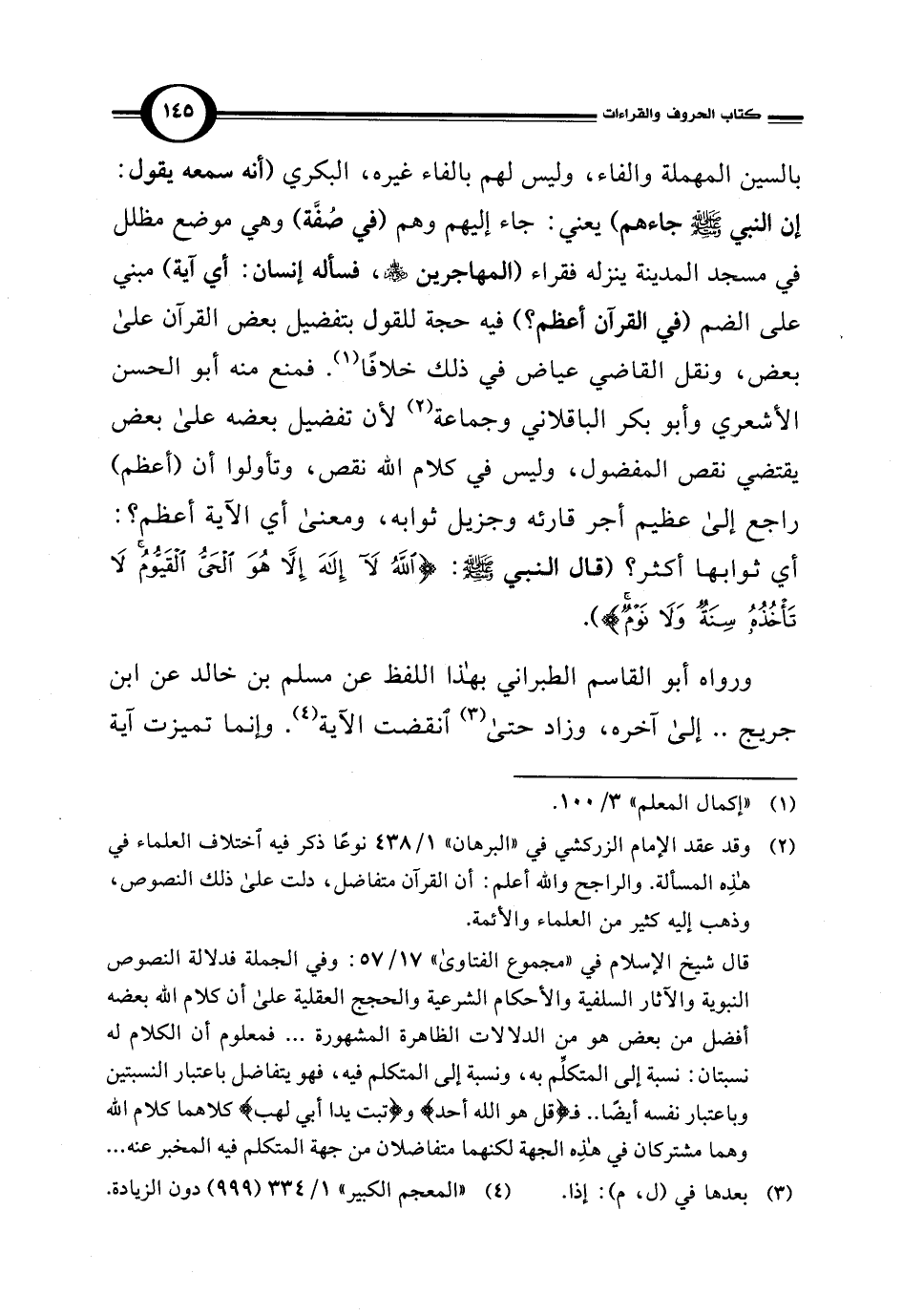 (¬2) وقد عقد الإمام الزركشي في "البرهان" 1/ 438 نوعًا ذكر فيه اختلاف العلماء في هذِه المسألة. والراجح واللَّه أعلم: أن القرآن متفاضل، دلت على ذلك النصوص، وذهب إليه كثير من العلماء والأئمة.