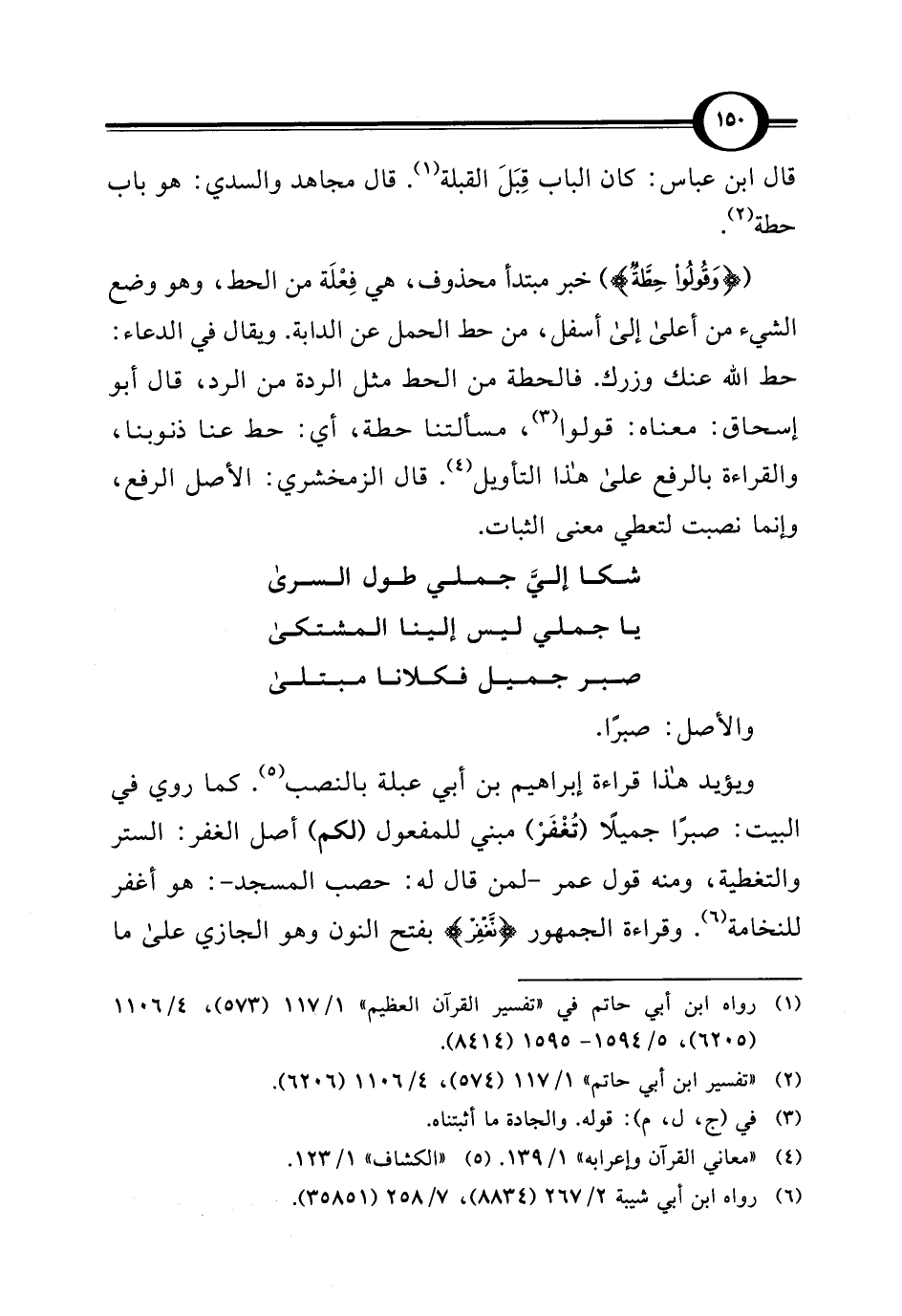 ({وَقُولُوا حِطَّةٌ}) خبر مبتدأ محذوف، هي فِعْلَة من الحط، وهو وضع الشيء من أعلى إلى أسفل، من حط الحمل عن الدابة. ويقال في الدعاء: حط اللَّه عنك وزرك. فالحطة من الحط مثل الردة من الرد، قال أبو إسحاق: معناه: قولوا (¬3)، مسألتنا حطة، أي: حط عنا ذنوبنا، والقراءة بالرفع على هذا التأويل (¬4). قال الزمخشري: الأصل الرفع، وإنما نصبت لتعطي معنى الثبات.