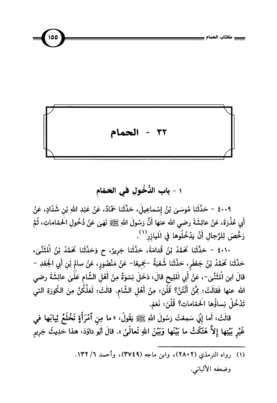 4009 - حَدَّثَنا مُوسَى بْن إِسْماعِيلَ، حَدَّثَنا حَمّادٌ، عَنْ عَبْدِ اللَّهِ بْنِ شَدّادٍ، عَنْ أَبي عُذْرَةَ، عَنْ عائِشَةَ رضي اللَّه عنها أَنَّ رَسُولَ اللَّهِ -صلى اللَّه عليه وسلم- نهَى عَنْ دُخُولِ الحَمّاماتِ، ثُمَّ رَخَّصَ لِلرِّجالِ أَنْ يَدْخُلُوها في المَيازِرِ (¬1).