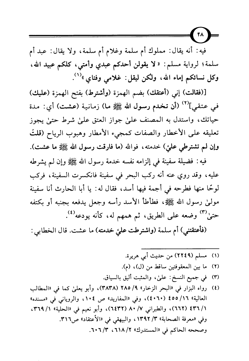 [(فقالت) إني (أعتقك) بضم الهمزة (وأشترط) بفتح الهمزة (عليك) في عتقي] (¬2) (أن تخدم رسول اللَّه -صلى اللَّه عليه وسلم- ما) زمانية (عشت) أي: مدة حياتك، واستدل به المصنف على جواز العتق على شرط حتى يجوز تعليقه على الأخطار والصفات كمجيء الأمطار وهبوب الرياح (قلتُ وإن لم تشترطي عليَّ) خدمته، فواللَّه (ما فارقت رسول اللَّه -صلى اللَّه عليه وسلم- ما عشت).