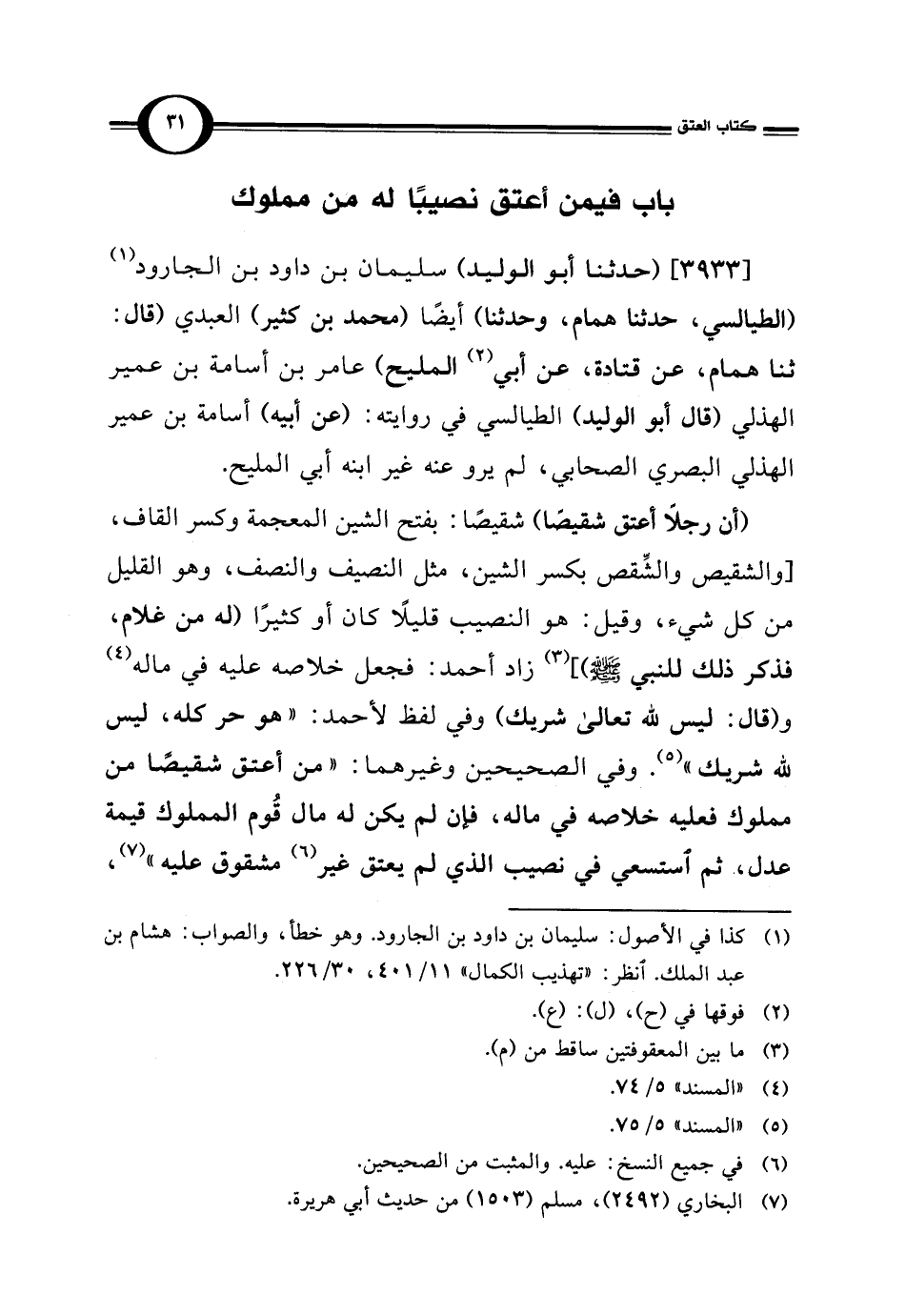 [3933] (حدثنا أبو الوليد) سليمان بن داود بن الجارود (¬1) (الطيالسي، حدثنا همام، وحدثنا) أيضًا (محمد بن كثير) العبدي (قال: ثنا همام، عن قتادة، عن أبي (¬2) المليح) عامر بن أسامة بن عمير الهذلي (قال أبو الوليد) الطيالسي في روايته: (عن أبيه) أسامة بن عمير الهذلي البصري الصحابي، لم يرو عنه غير ابنه أبي المليح.
