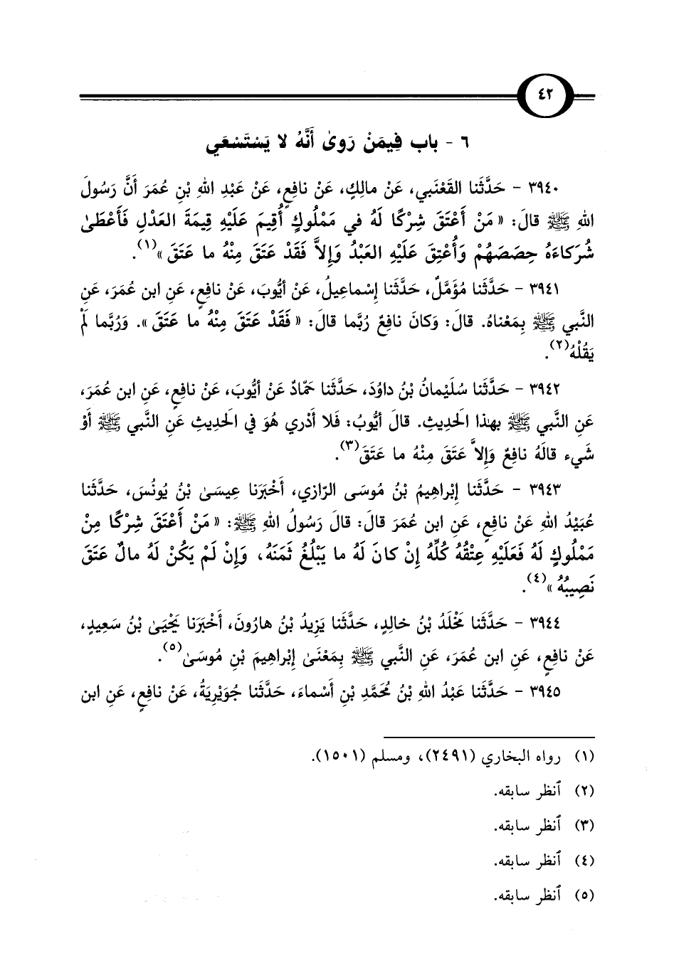 3942 - حَدَّثَنا سُلَيْمانُ بْنُ داوُدَ، حَدَّثَنا حَمّادٌ عَنْ أيُّوبَ، عَنْ نافِعٍ، عَنِ ابن عُمَرَ، عَنِ النَّبي -صلى اللَّه عليه وسلم- بهذا الحَدِيثِ. قالَ أيُّوبُ: فَلا أَدْري هُوَ في الحَدِيثِ عَنِ النَّبي -صلى اللَّه عليه وسلم- أَوْ شَيء قالَهُ نافِعٌ وَإِلَّا عَتَقَ مِنْهُ ما عَتَقَ (¬3).