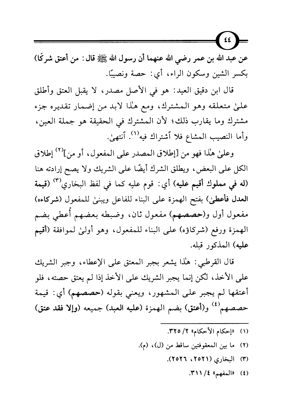 وعلى هذا فهو من [إطلاق المصدر على المفعول، أو من] (¬2) إطلاق الكل على البعض، ويطلق الشرك أيضًا على الشريك ولا يصح إرادته هنا (له في مملوك أقيم عليه) أي: قوم عليه كما في لفظ البخاري (¬3) (قيمة العدل فأعطى) بفتح الهمزة على البناء للفاعل ويبنى للمفعول (شركاءه) مفعول أول و (حصصهم) مفعول ثان، وضبطه بعضهم أُعطي بضم الهمزة ورفع (شركاؤه) على البناء للمفعول، وهو أولى لموافقة (أقيم عليه) المذكور قبله.