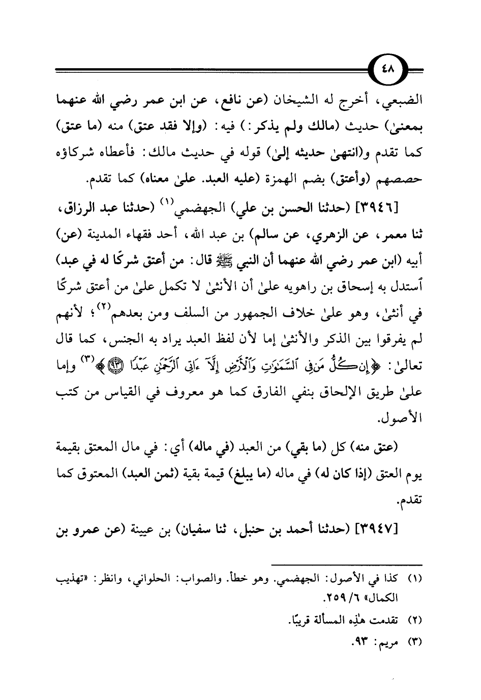 [3946] (حدثنا الحسن بن علي) الجهضمي (¬1) (حدثنا عبد الرزاق، ثنا معمر، عن الزهري، عن سالم) بن عبد اللَّه، أحد فقهاء المدينة (عن) أبيه (ابن عمر رضي اللَّه عنهما أن النبي -صلى اللَّه عليه وسلم- قال: من أعتق شركًا له في عبد) استدل به إسحاق بن راهويه على أن الأنثى لا تكمل على من أعتق شركًا في أنثى، وهو على خلاف الجمهور من السلف ومن بعدهم (¬2)؛ لأنهم لم يفرقوا بين الذكر والأنثى إما لأن لفظ العبد يراد به الجنس، كما قال تعالى: {إِنْ كُلُّ مَنْ فِي السَّمَاوَاتِ وَالْأَرْضِ إِلَّا آتِي الرَّحْمَنِ عَبْدًا (93)} (¬3) وإما على طريق الإلحاق بنفي الفارق كما هو معروف في القياس من كتب الأصول.