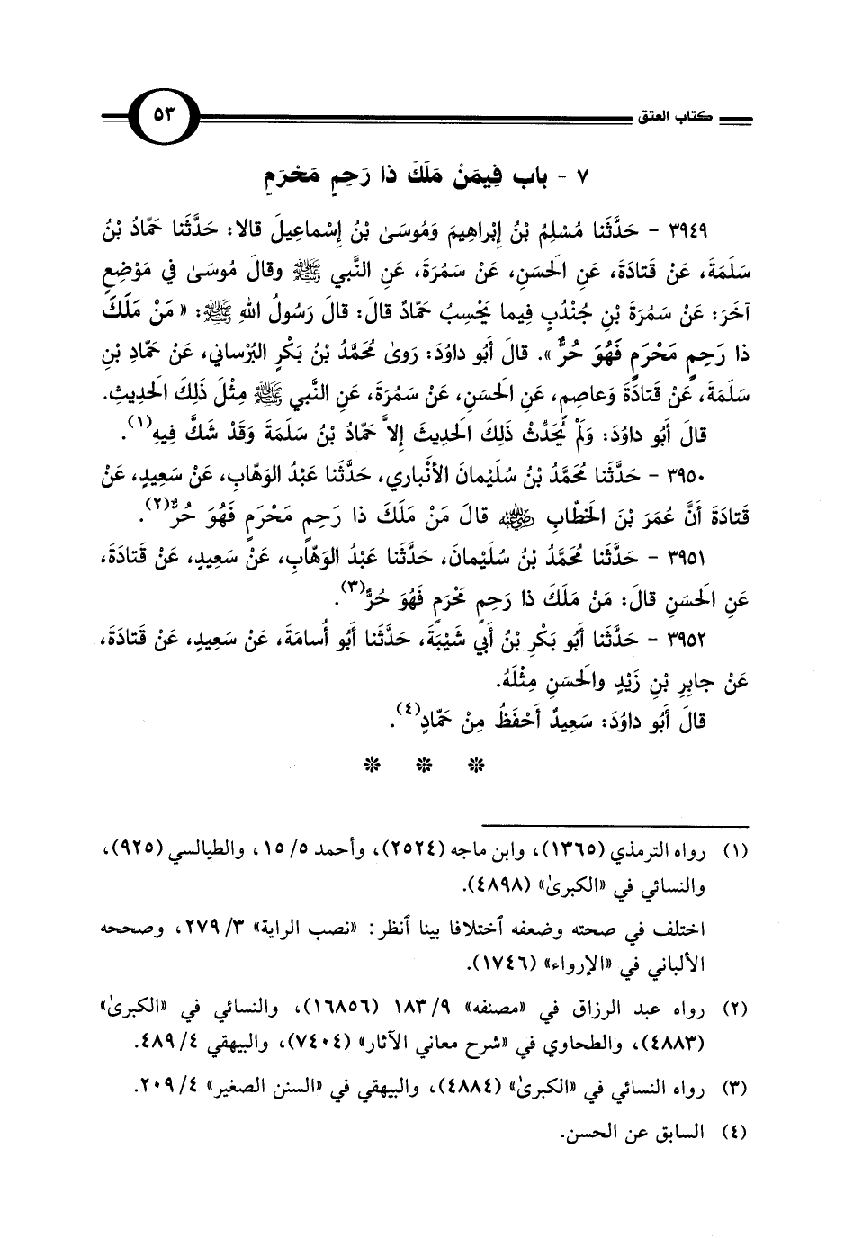 3949 - حَدَّثَنا مُسْلِمٌ بْنُ إِبْراهِيمَ وَمُوسَى بن إِسْماعِيلَ قالا: حَدَّثَنا حَمّادُ بْنُ سَلَمَةَ، عَنْ قَتادَةَ، عَنِ الحَسَنِ، عَنْ سَمُرَةَ، عَنِ النَّبي -صلى اللَّه عليه وسلم- وقالَ مُوسَى في مَوْضِعٍ آخَرَ: عَنْ سَمُرَةَ بْنِ جُنْدُبِ فِيما يَحْسِبُ حَمّادٌ قالَ: قالَ رَسُول اللَّهِ -صلى اللَّه عليه وسلم-: "مَنْ مَلَكَ ذا رَحِمٍ مَحْرَمٍ فَهُوَ حُرٌّ". قالَ أبو داوُدَ: رَوى مُحَمَّدُ بْنُ بَكْرٍ البُرْساني، عَنْ حَمّادِ بْنِ سَلَمَةَ، عَنْ قَتادَةَ وَعاصِمٍ، عَنِ الحَسَنِ، عَنْ سَمُرَةَ، عَنِ النَّبي -صلى اللَّه عليه وسلم- مِثْلَ ذَلِكَ الحَدِيثِ.