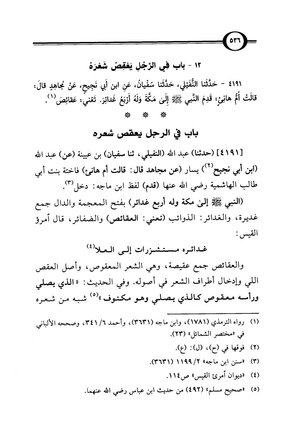 [4191] (حدثنا) عبد اللَّه (النفيلي، ثنا سفيان) بن عيينة (عن) عبد اللَّه (ابن أبي نجيح) (¬2) يسار (عن مجاهد قال: قالت أم هانئ) فاختة بنت أبي طالب الهاشمية رضي اللَّه عنها (قدم) لفظ ابن ماجه: دخل (¬3).