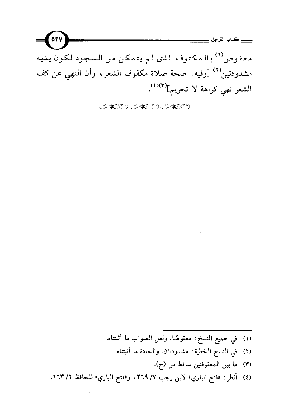 معقوص (¬1) بالمكتوف الذي لم يتمكن من السجود لكون يديه مشدودتين (¬2) [وفيه: صحة صلاة مكفوف الشعر، وأن النهي عن كف الشعر نهي كراهة لا تحريم] (¬3) (¬4).
