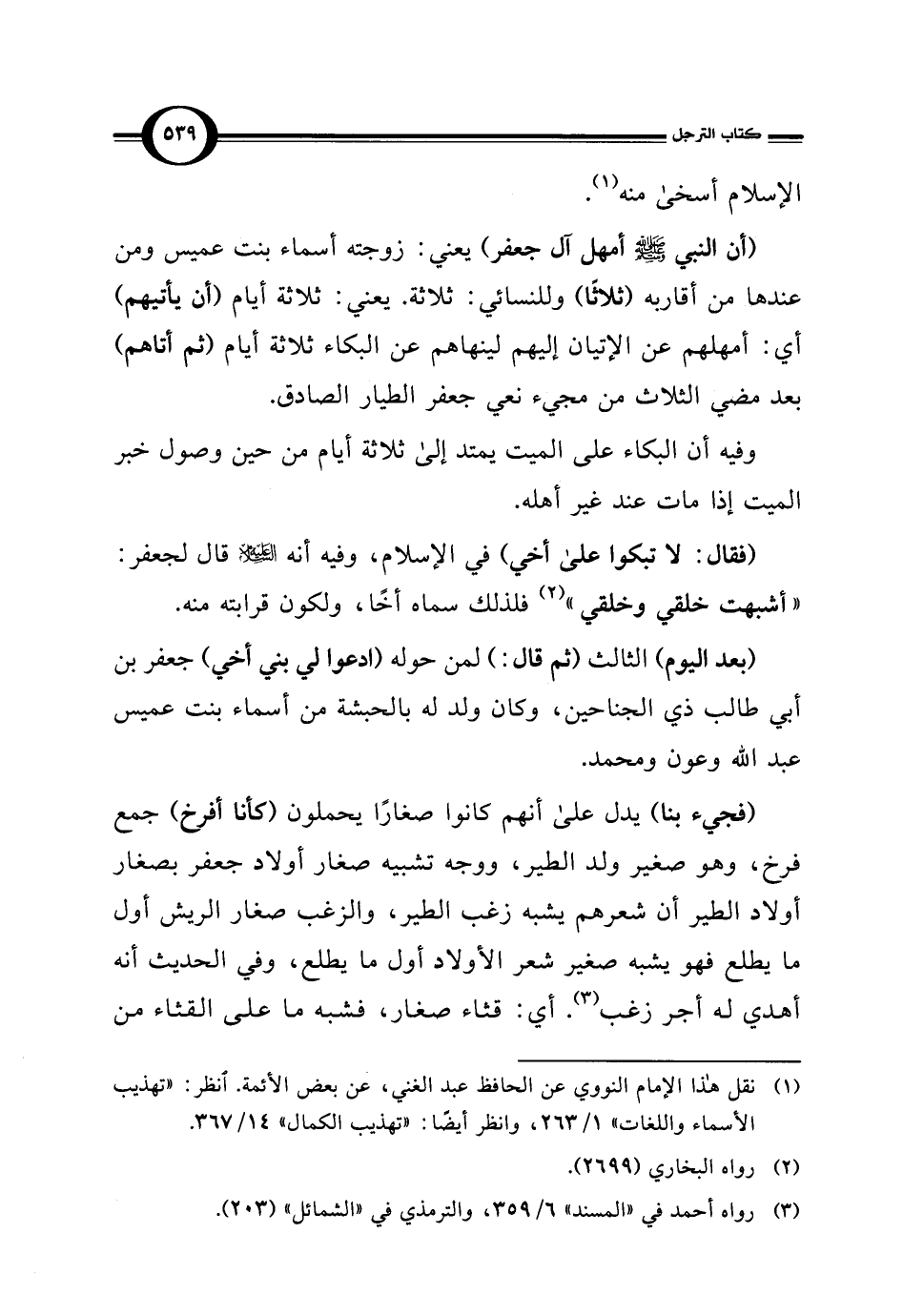 (أن النبي -صلى اللَّه عليه وسلم- أمهل آل جعفر) يعني: زوجته أسماء بنت عميس ومن عندها من أقاربه (ثلاثًا) وللنسائي: ثلاثة. يعني: ثلاثة أيام (أن يأتيهم) أي: أمهلهم عن الإتيان إليهم لينهاهم عن البكاء ثلاثة أيام (ثم أتاهم) بعد مضي الثلاث من مجيء نعي جعفر الطيار الصادق.