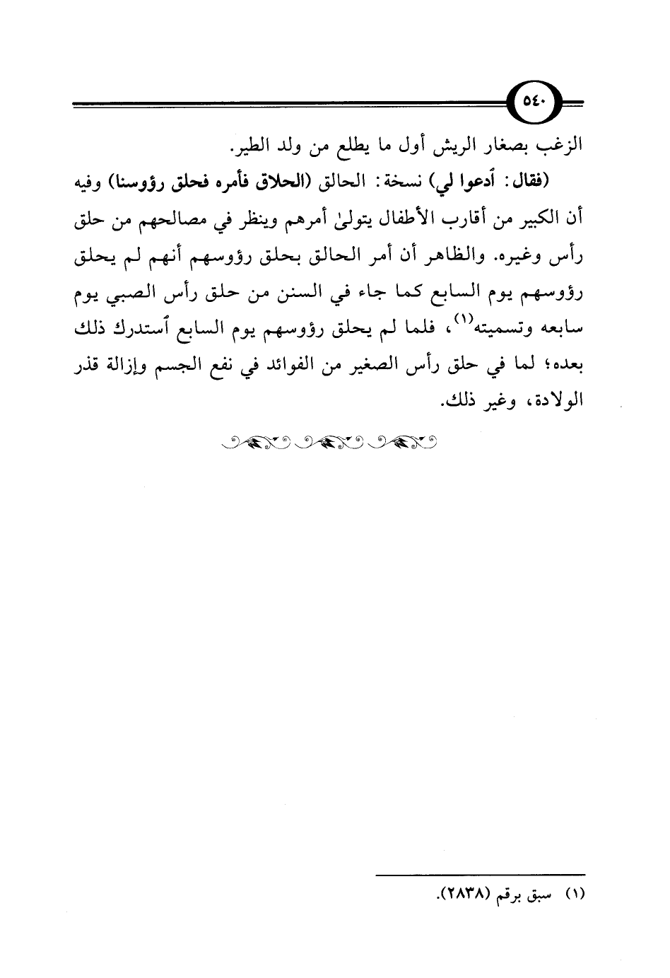 (فقال: ادعوا لي) نسخة: الحالق (الحلاق فأمره فحلق رؤوسنا) وفيه أن الكبير من أقارب الأطفال يتولى أمرهم وينظر في مصالحهم من حلق رأس وغيره. والظاهر أن أمر الحالق بحلق رؤوسهم أنهم لم يحلق رؤوسهم يوم السابع كما جاء في السنن من حلق رأس الصبي يوم سابعه وتسميته (¬1)، فلما لم يحلق رؤوسهم يوم السابع استدرك ذلك بعده؛ لما في حلق رأس الصغير من الفوائد في نفع الجسم وإزالة قذر الولادة، وغير ذلك.