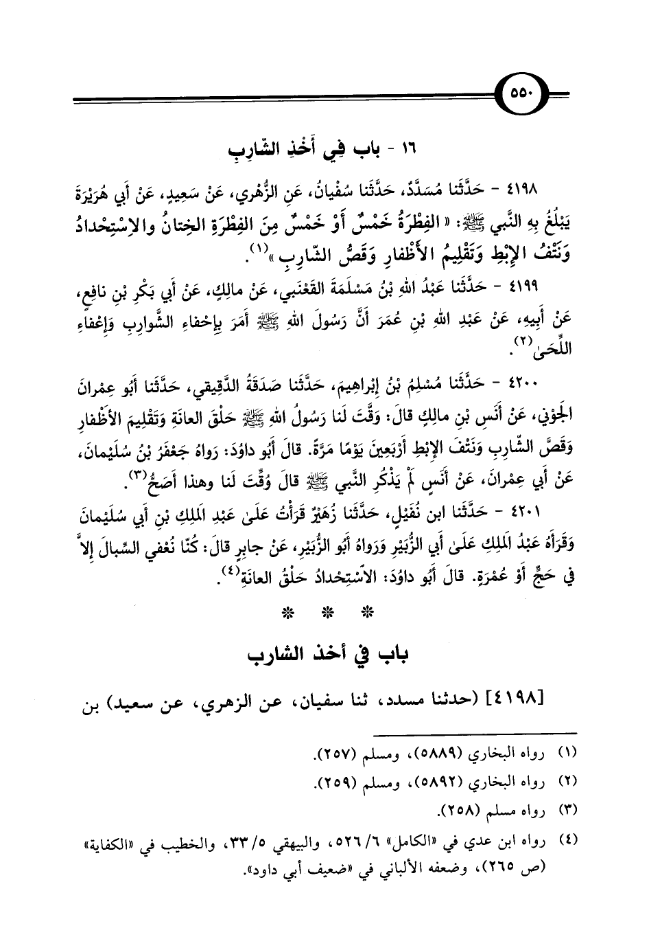 4198 - حَدَّثَنا مُسَدَّدٌ، حَدَّثَنا سُفْيانُ، عَنِ الزُّهْري، عَنْ سَعِيدٍ، عَنْ أَبي هُرَيْرَةَ يَبْلُغُ بِهِ النَّبي -صلى اللَّه عليه وسلم-: "الفِطْرَةُ خَمْسٌ أَوْ خَمْسٌ مِنَ الفِطْرَةِ الخِتانُ والاسْتِحْدادُ وَنَتْفُ الإِبْطِ وَتَقْلِيمُ الأَظْفارِ وَقَصُّ الشّارِبِ" (¬1).