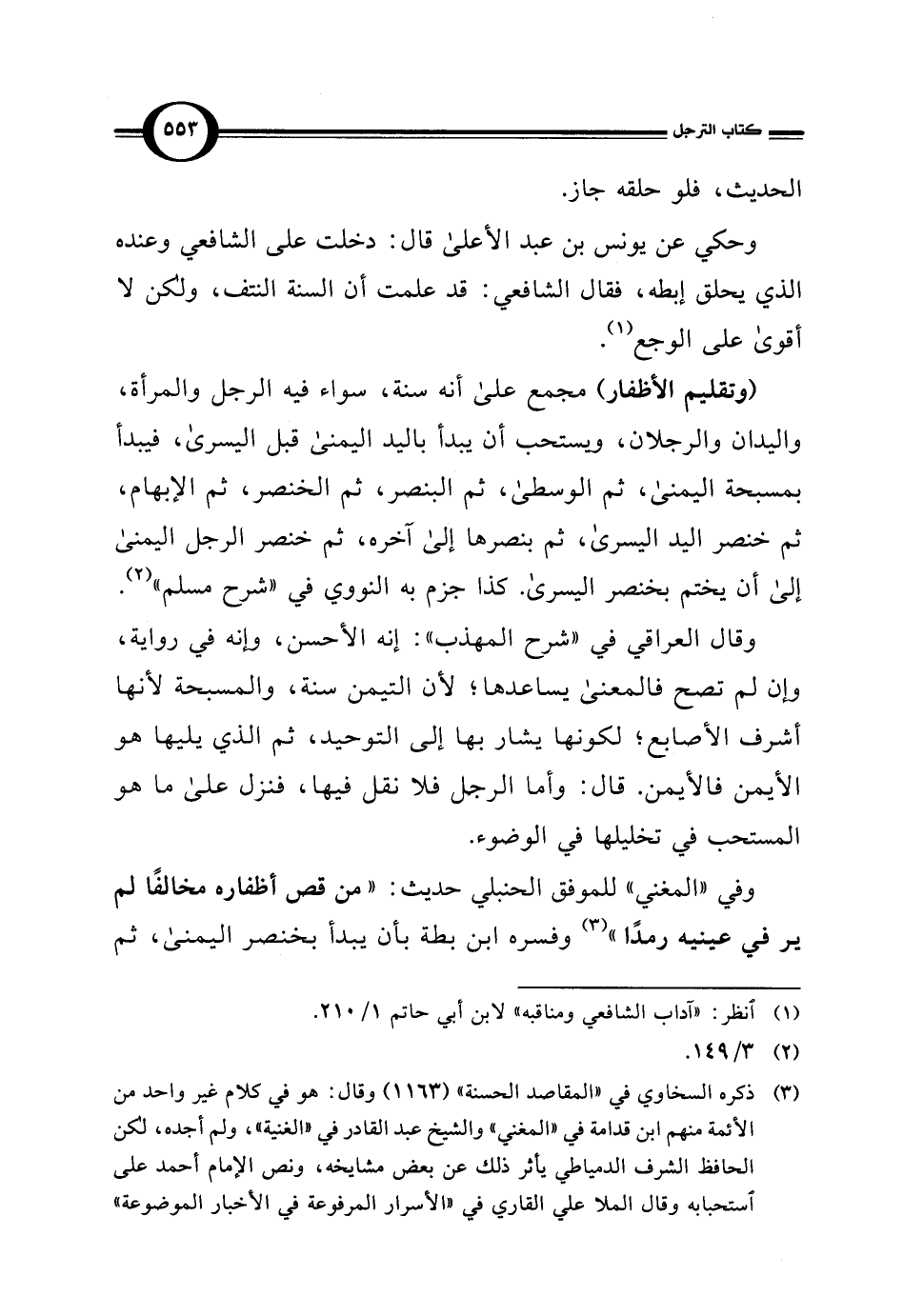 (وتقليم الأظفار) مجمع على أنه سنة، سواء فيه الرجل والمرأة، واليدان والرجلان، ويستحب أن يبدأ باليد اليمنى قبل اليسرى، فيبدأ بمسبحة اليمنى، ثم الوسطى، ثم البنصر، ثم الخنصر، ثم الإبهام، ثم خنصر اليد اليسرى، ثم بنصرها إلى آخره، ثم خنصر الرجل اليمنى إلى أن يختم بخنصر اليسرى. كذا جزم به النووي في "شرح مسلم" (¬2).