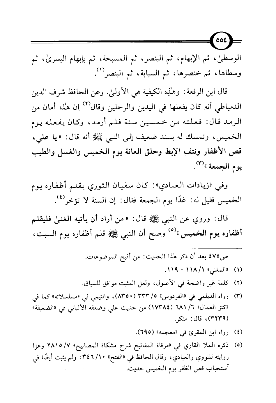 (¬5) ذكره الملا القاري في "مرقاة المفاتيح شرح مشكاة المصابيح" 7/ 2815 وعزا روايته للنووي والعبادي، وقال الحافظ في "الفتح" 10/ 346: ولم يثبت أيضًا في استحباب قص الظفر يوم الخميس حديث.