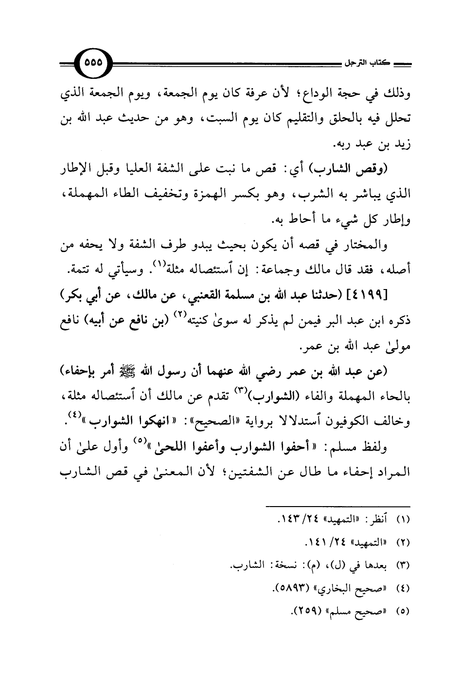 (عن عبد اللَّه بن عمر رضي اللَّه عنهما أن رسول اللَّه -صلى اللَّه عليه وسلم- أمر بإحفاء) بالحاء المهملة والفاء (الشوارب) (¬3) تقدم عن مالك أن استئصاله مثلة، وخالف الكوفيون استدلالا برواية "الصحيح": "انهكوا الشوارب" (¬4).