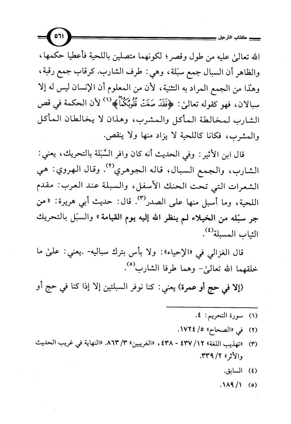 اللَّه تعالى عليه من طول وقصر؛ لكونهما متصلين باللحية فأعطيا حكمها، والظاهر أن السبال جمع سبَلة، وهي: طرف الشارب. كرقاب جمع رقبة، وهذا من الجمع المراد به التثنية، لأن من المعلوم أن الإنسان ليس له إلا سبالان، فهو كقوله تعالى: {فَقَدْ صَغَتْ قُلُوبُكُمَا} (¬1) لأن الحكمة في قص الشارب لمخالطة المأكل والمشرب، وهذان لا يخالطان المأكل والمشرب، فكانا كاللحية لا يزاد منها ولا ينقص.