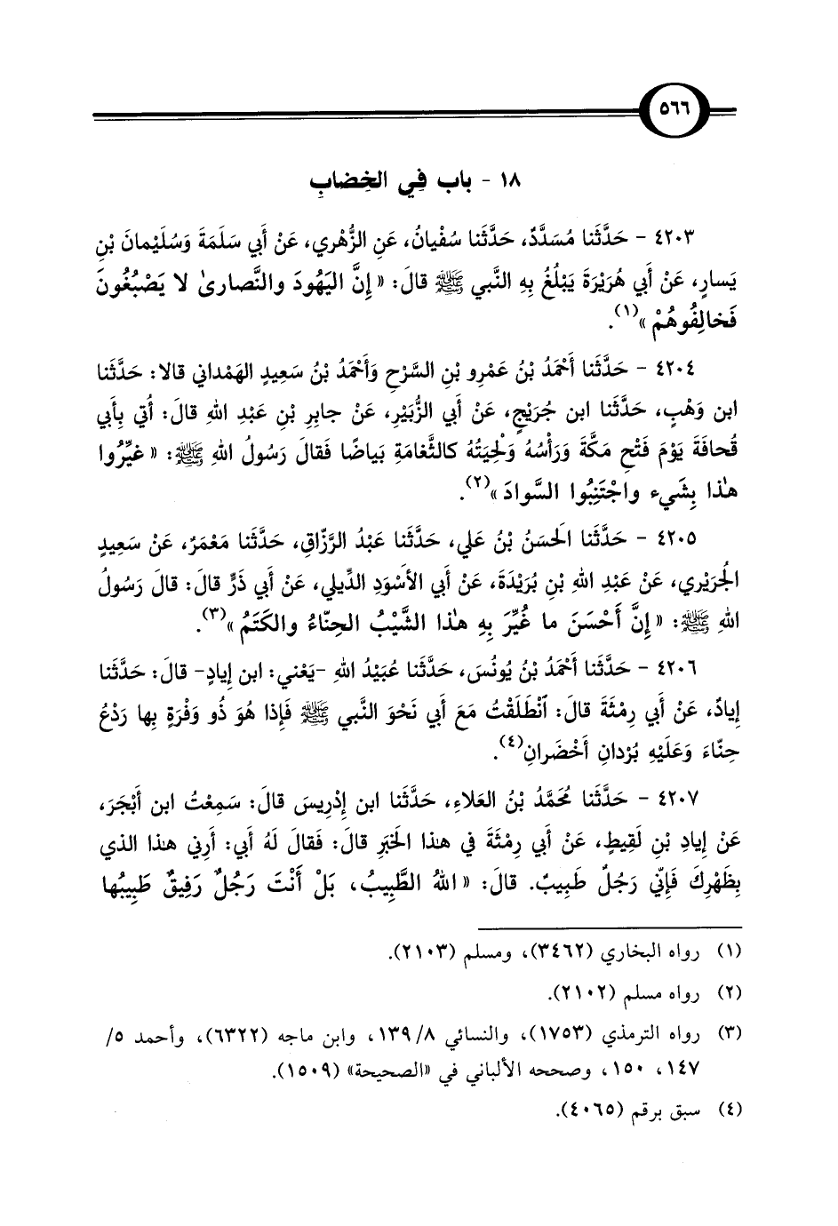 4204 - حَدَّثَنا أَحْمَدُ بْنُ عَمْرِو بْنِ السَّرْحِ وَأَحْمَدُ بْنُ سَعِيدٍ الهَمْداني قالا: حَدَّثَنا ابن وَهْبٍ، حَدَّثَنا ابن جُرَيْجٍ، عَنْ أَبي الزُّبَيْرِ، عَنْ جابِرِ بْنِ عَبْدِ اللَّهِ قالَ: أُتي بِأَبي قُحافَةَ يَوْمَ فَتْحِ مَكَّةَ وَرَأْسُهُ وَلِحْيَتُهُ كالثَّغامَةِ بَياضًا فَقالَ رَسُولُ اللَّهِ -صلى اللَّه عليه وسلم-: "غيِّرُوا فذا بِشَيء واجْتَنِبُوا السَّوادَ" (¬2).