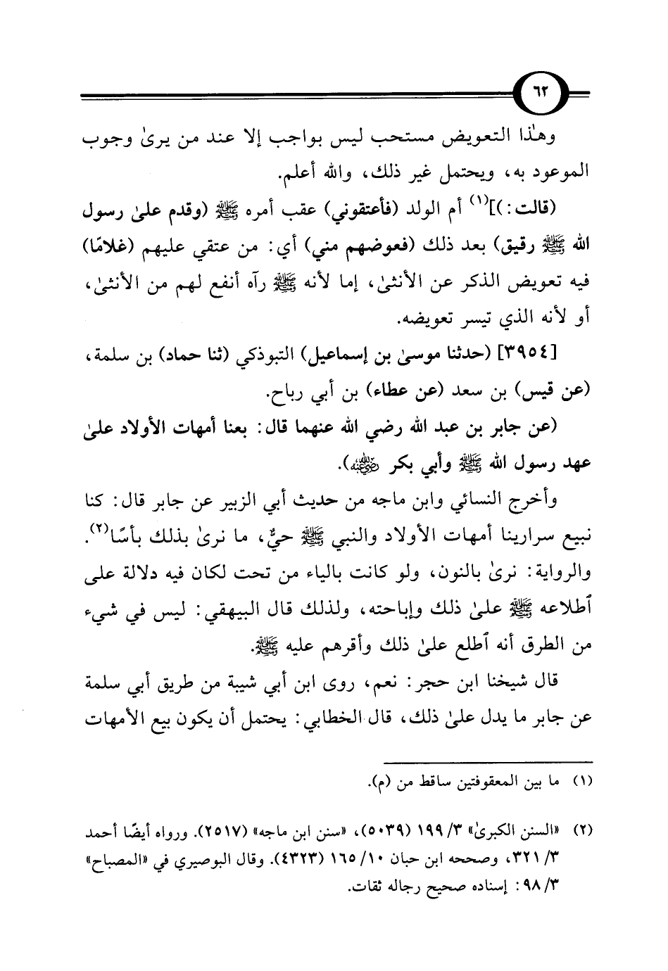 (عن جابر بن عبد اللَّه رضي اللَّه عنهما قال: بعنا أمهات الأولاد على عهد رسول اللَّه -صلى اللَّه عليه وسلم- وأبي بكر -رضي اللَّه عنه-).