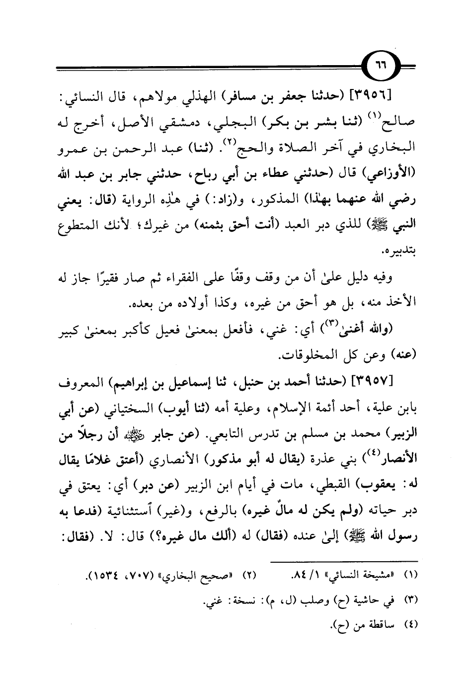 [3957] (حدثنا أحمد بن حنبل، ثنا إسماعيل بن إبراهيم) المعروف بابن علية، أحد أئمة الإسلام، وعلية أمه (ثنا أيوب) السختياني (عن أبي الزبير) محمد بن مسلم بن تدرس التابعي. (عن جابر -رضي اللَّه عنه- أن رجلًا من الأنصار) (¬4) بني عذرة (يقال له أبو مذكور) الأنصاري (أعتق غلامًا يقال له: يعقوب) القبطي، مات في أيام ابن الزبير (عن دبر) أي: يعتق في دبر حياته (ولم يكن له مالٌ غيره) بالرفع، و (غير) استثنائية (فدعا به رسول اللَّه -صلى اللَّه عليه وسلم-) إلى عنده (فقال) له (ألك مال غيره؟ ) قال: لا. (فقال: