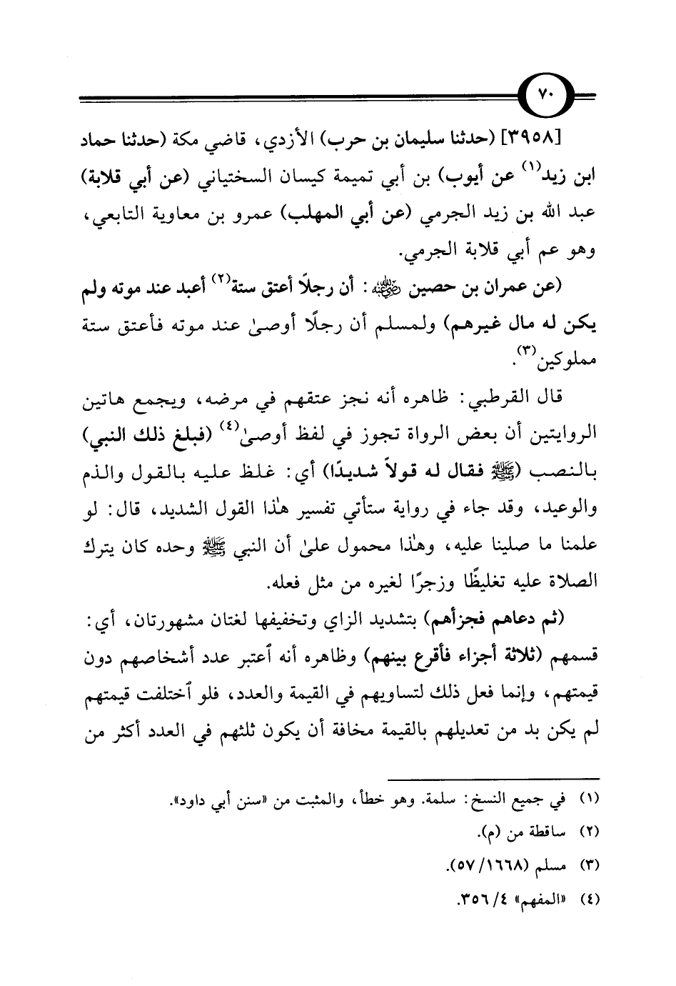 (عن عمران بن حصين -رضي اللَّه عنه-: أن رجلًا أعتق ستة (¬2) أعبد عند موته ولم يكن له مال غيرهم) ولمسلم أن رجلًا أوصى عند موته فأعتق ستة مملوكين (¬3).