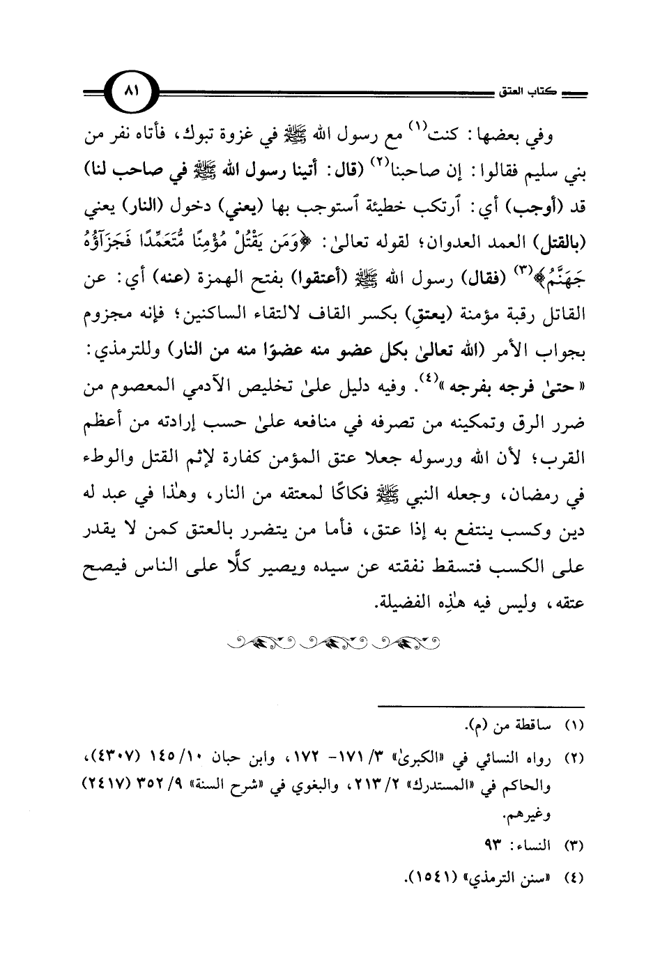 وفي بعضها: كنت (¬1) مع رسول اللَّه -صلى اللَّه عليه وسلم- في غزوة تبوك، فأتاه نفر من بني سليم فقالوا: إن صاحبنا (¬2) (قال: أتينا رسول اللَّه -صلى اللَّه عليه وسلم- في صاحب لنا) قد (أوجب) أي: ارتكب خطيئة استوجب بها (يعني) دخول (النار) يعني (بالقتل) العمد العدوان؛ لقوله تعالى: {وَمَنْ يَقْتُلْ مُؤْمِنًا مُتَعَمِّدًا فَجَزَاؤُهُ جَهَنَّمُ} (¬3) (فقال) رسول اللَّه -صلى اللَّه عليه وسلم- (أعتقوا) بفتح الهمزة (عنه) أي: عن القاتل رقبة مؤمنة (يعتقِ) بكسر القاف لالتقاء الساكنين؛ فإنه مجزوم بجواب الأمر (اللَّه تعالى بكل عضو منه عضوًا منه من النار) وللترمذي: "حتى فرجه بفرجه" (¬4). وفيه دليل على تخليص الآدمي المعصوم من ضرر الرق وتمكينه من تصرفه في منافعه على حسب إرادته من أعظم القرب؛ لأن اللَّه ورسوله جعلا عتق المؤمن كفارة لإثم القتل والوطء في رمضان، وجعله النبي -صلى اللَّه عليه وسلم- فكاكًا لمعتقه من النار، وهذا في عبد له دين وكسب ينتفع به إذا عتق، فأما من يتضرر بالعتق كمن لا يقدر على الكسب فتسقط نفقته عن سيده ويصير كلًّا على الناس فيصح عتقه، وليس فيه هذِه الفضيلة.