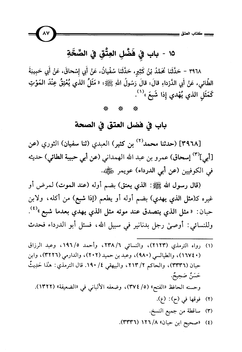 3968 - حَدَّثَنا مُحَمَّدُ بْنُ كَثِيرٍ، حَدَّثَنا سُفْيانُ، عَنْ أَبي إِسْحاقَ، عَنْ أَبي حَبِيبَةَ الطّائي، عَنْ أَبِي الدَّرْداءِ قالَ: قالَ رَسُولُ اللَّهِ -صلى اللَّه عليه وسلم-: "مَثَلُ الذي يُعْتِقُ عِنْدَ المَوْتِ كَمَثَلِ الذي يُهْدي إِذا شَبعَ" (¬1).