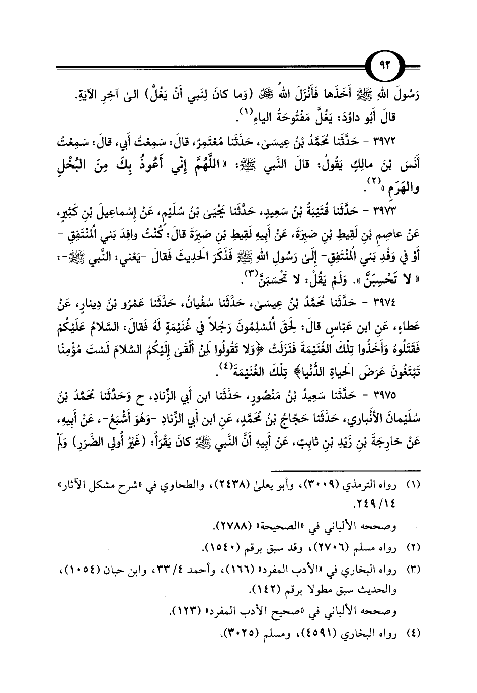 3972 - حَدَّثَنا مُحَمَّد بْن عِيسَى، حَدَّثَنا مُعْتَمِرٌ، قالَ: سَمِعْتُ أَبِي، قالَ: سَمِعْتُ أَنَسَ بْنَ مالِكٍ يَقُولُ: قالَ النَّبي -صلى اللَّه عليه وسلم-: "اللَّهُمَّ إِنّي أَعُوذُ بِكَ مِنَ البُخْلِ والهَرَمِ" (¬2).