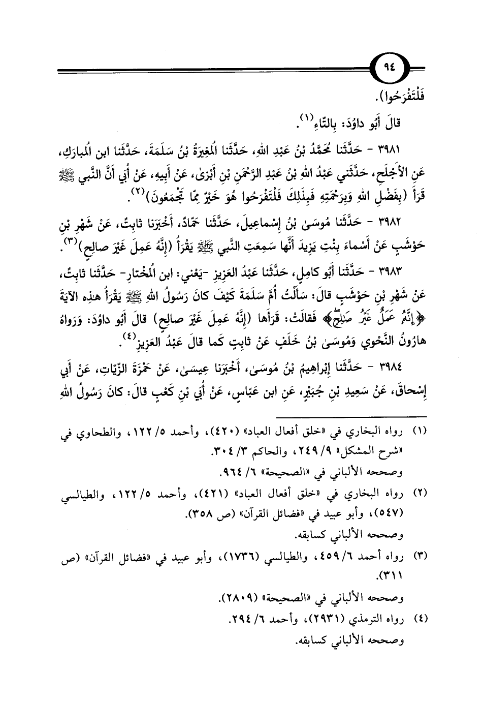 3983 - حَدَّثَنا أَبُو كامِلٍ، حَدَّثَنا عَبْدُ العَزِيزِ -يَعْني: ابن المُخْتارِ- حَدَّثَنا ثابِتٌ، عَنْ شَهْرِ بْنِ حَوْشَبٍ قالَ: سَأَلْتُ أُمَّ سَلَمَةَ كَيْفَ كانَ رَسُولُ اللَّهِ -صلى اللَّه عليه وسلم- يَقْرَأُ هذِه الآيَةَ {إِنَّهُ عَمَلٌ غَيْرُ صَالِحٍ} فَقالَتْ: قَرَأَها (إِنَّهُ عَمِلَ غَيْرَ صالِحٍ) قالَ أَبُو داوُدَ: وَرَواهُ هارُونُ النَّحْوي وَمُوسَى بْن خَلَفٍ عَنْ ثابِتٍ كَما قالَ عَبْدُ العَزِيزِ (¬4).