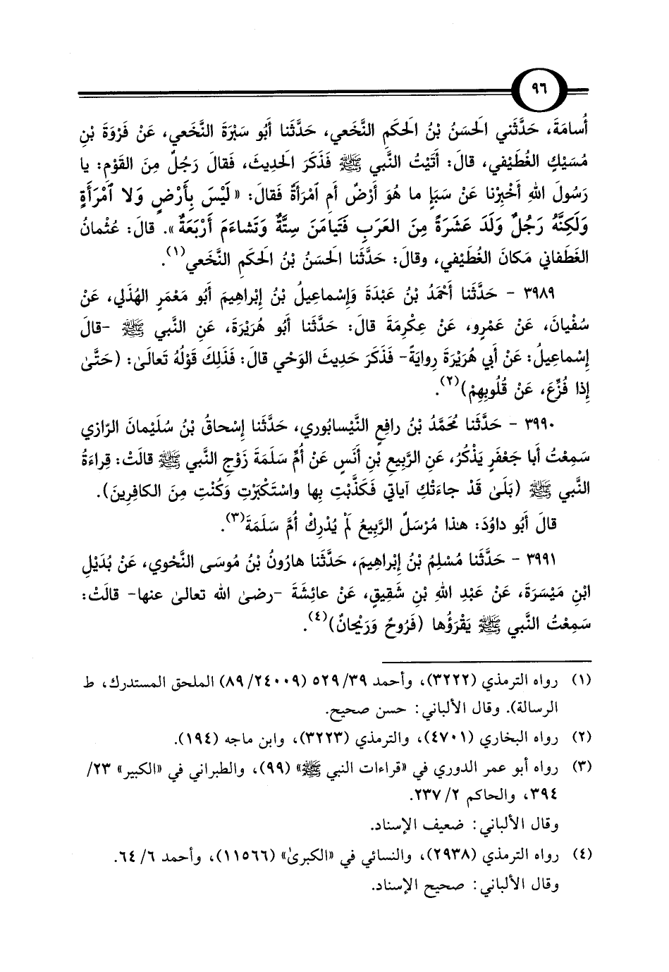 3990 - حَدَّثَنا مُحَمَّدُ بْنُ رافِعٍ النَّيْسابُوري، حَدَّثَنا إِسْحاقُ بْنُ سُلَيْمانَ الرّازي سَمِعْتُ أَبا جَعْفَرٍ يَذْكُرُ، عَنِ الرَّبِيعِ بْنِ أَنَسٍ عَنْ أُمِّ سَلَمَةَ زَوْجِ النَّبي -صلى اللَّه عليه وسلم- قالَتْ: قِراءَةُ النَّبي -صلى اللَّه عليه وسلم- (بَلَى قَدْ جاءَتْكِ آياتي فَكَذَّبْتِ بِها واسْتَكْبَرْتِ وَكُنْتِ مِنَ الكافِرِينَ).
