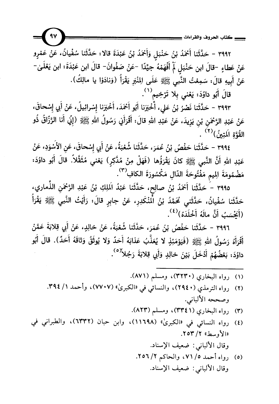 3995 - حَدَّثَنا أَحْمَدُ بْنُ صالِحٍ، حَدَّثَنا عَبْدُ المَلِكِ بْنُ عَبْدِ الرَّحْمَنِ الذِّماري، حَدَّثَنا سُفْيانُ، حَدَّثَني مُحَمَّدُ بْنُ المُنْكَدِرِ، عَنْ جابِرٍ قالَ: رَأَيْتُ النَّبي -صلى اللَّه عليه وسلم- يَقْرَأُ (أَيَحْسَبُ أَنَّ مالَهُ أَخْلَدَهُ) (¬4).