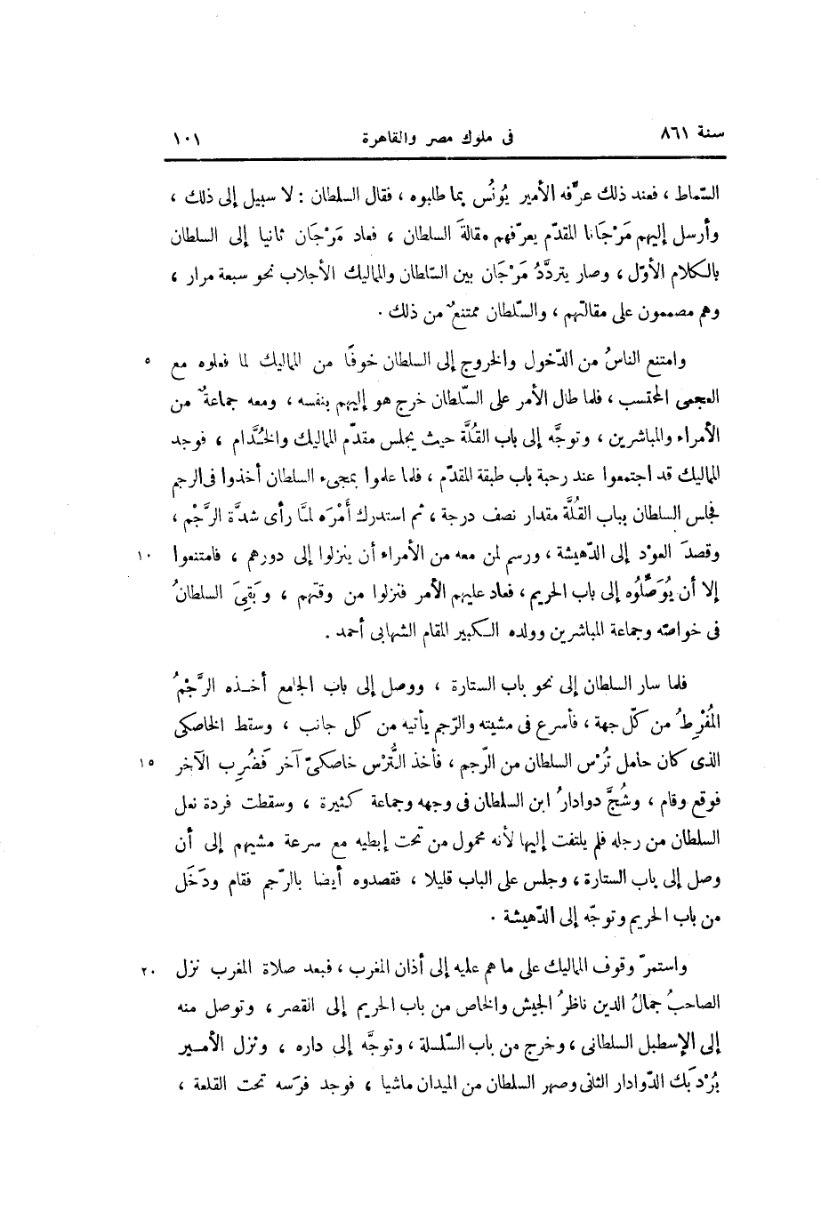 فلما سار السلطان إلى نحو باب الستارة، ووصل إلى باب الجامع أخذه الرّجم المفرط من كلّ جهة، فأسرع في مشيته والرّجم يأتيه من كل جانب، وسقط الخاصكى الذي كان حامل ترس السلطان من الرّجم، فأخذ التّرس خاصكىّ آخر فضرب الآخر فوقع وقام، وشجّ دوادار ابن السلطان في وجهه وجماعة كثيرة، وسقطت فردة نعل السلطان من رجله فلم يلتفت إليها لأنه محمول من تحت إبطيه مع سرعة مشيهم إلى أن وصل إلى باب الستارة، وجلس على الباب قليلا، فقصدوه أيضا بالرّجم فقام ودخل من باب الحريم وتوجّه إلى الدّهيشة.