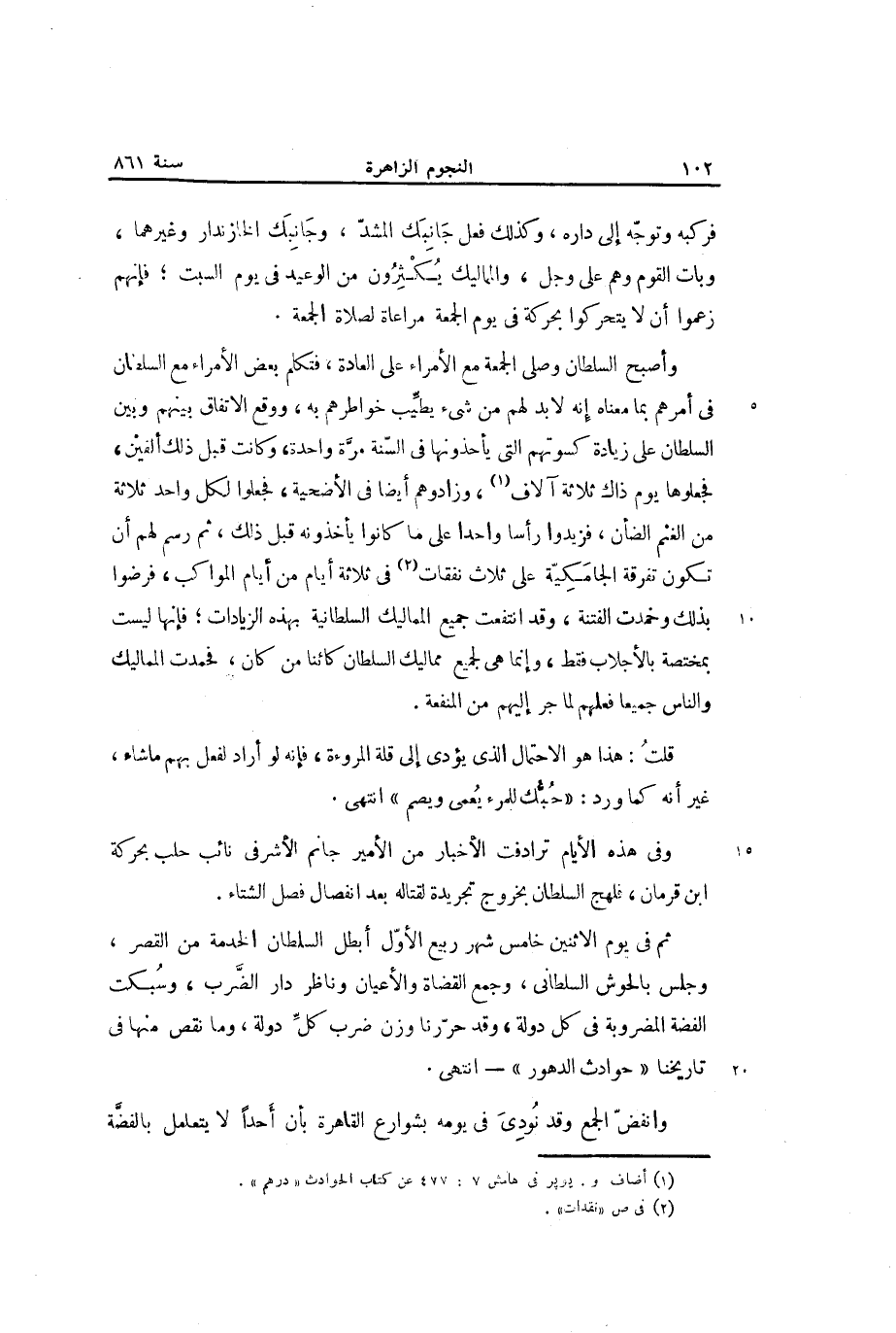 ثم في يوم الاثنين خامس شهر ربيع الأوّل أبطل السلطان الخدمة من القصر، وجلس بالحوش السلطانى، وجمع القضاة والأعيان وناظر دار الضّرب، وسبكت الفضة المضروبة في كل دولة، وقد حرّرنا وزن ضرب كلّ دولة، وما نقص منها في تاريخنا «حوادث الدهور» - انتهى.