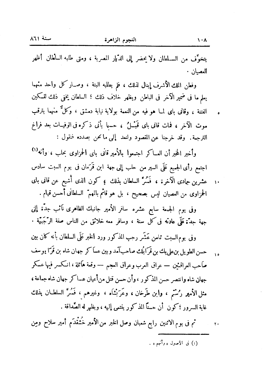 وفي يوم السبت ثامن عشر رجب المذكور ورد الخبر على السلطان بأنه كان بين حسن الطويل بن على بك بن قرايلك صاحب آمد وبين عساكر جهان شاه بن قرا يوسف صاحب العراقين- عراق العرب وعراق العجم- وقعة هائلة، انكسر فيها عسكر جهان شاه وانتصر حسن المذكور، وأن حسن قتل من أعيان عساكر جهان شاه جماعة، مثل الأمير رستم، وابن طرخان، وعربشاه، وغيرهم، فسرّ السلطان بذلك غاية السرور؛ كون أن حسنا المذكور ينتمى إليه، ويظهر له الصّداقة.