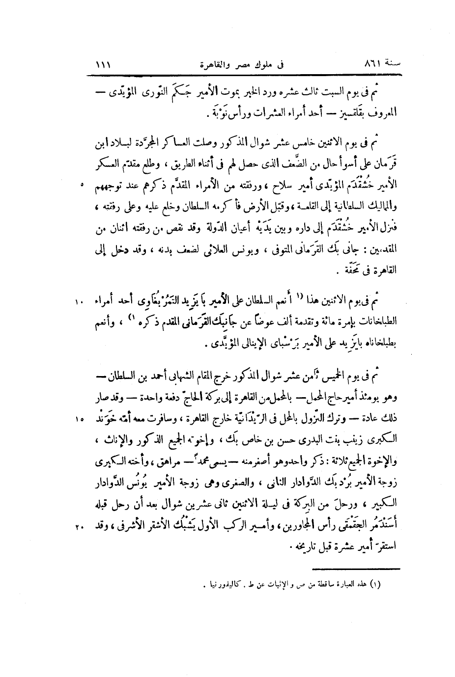 ثم في يوم الاثنين خامس عشر شوال المذكور وصلت العساكر المجرّدة لبلاد ابن قرمان على أسوأ حال من الضّعف الذي حصل لهم في أثناء الطريق، وطلع مقدّم العسكر الأمير خشقدم المؤيّدى أمير سلاح، ورفقته من الأمراء المقدّم ذكرهم عند توجههم والمماليك السلطانية إلى القلعة، وقبّل الأرض فأكرمه السلطان وخلع عليه وعلى رفقته، فنزل الأمير خشقدم إلى داره وبين يديه أعيان الدّولة وقد نقص من رفقته اثنان من المقدمين: جانى بك القرمانى المتوفى، ويونس العلائى لضعف بدنه، وقد دخل إلى القاهرة في محفّة.