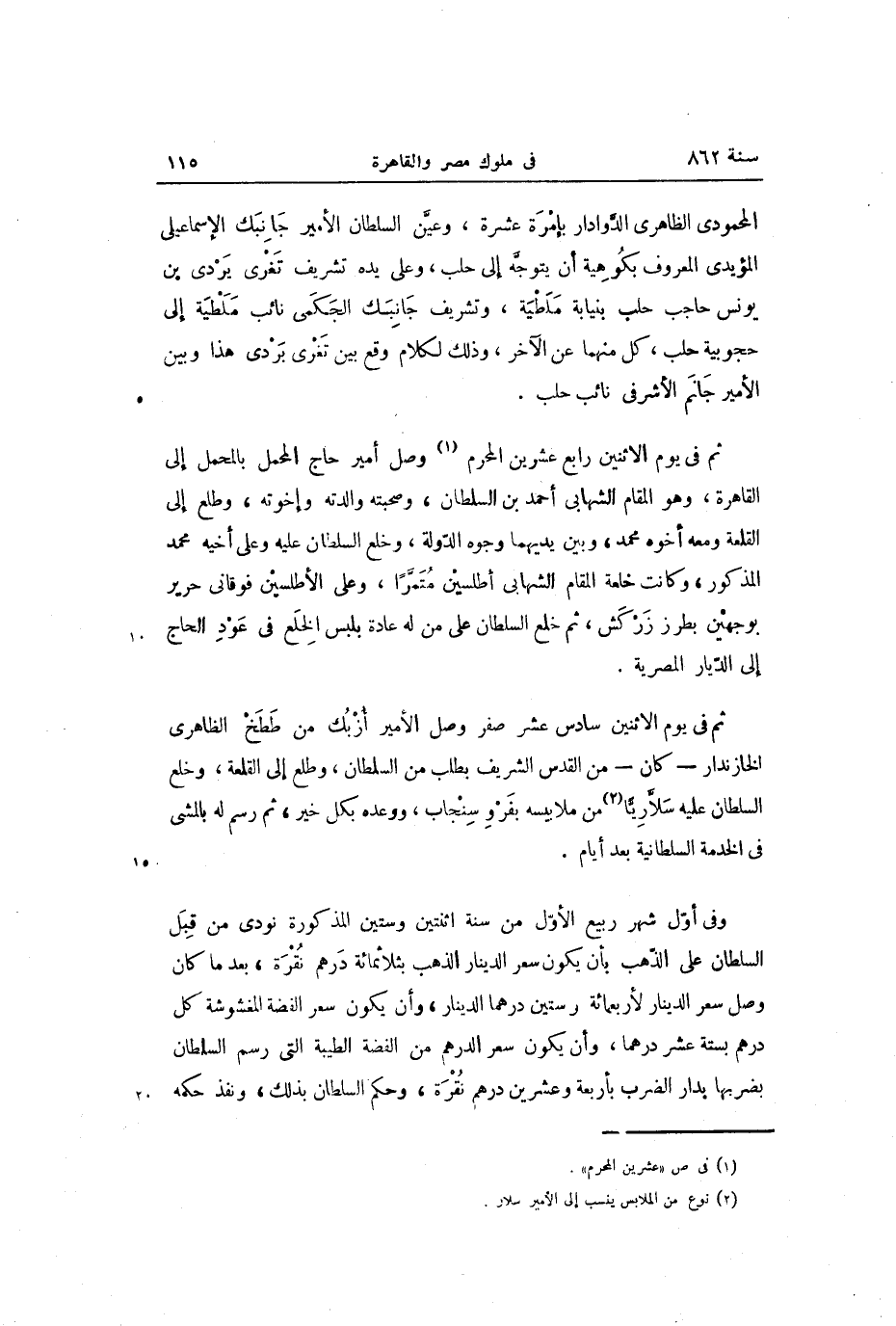 وفي أوّل شهر ربيع الأوّل من سنة اثنتين وستين المذكورة نودى من قبل السلطان على الذّهب بأن يكون سعر الدينار الذهب بثلاثمائة درهم نقرة، بعد ما كان وصل سعر الدينار لأربعمائة وستين درهما الدينار، وأن يكون سعر الفضة المغشوشة كل درهم بستة عشر درهما، وأن يكون سعر الدرهم من الفضة الطيبة التي رسم السلطان بضربها بدار الضرب بأربعة وعشرين درهم نقرة، وحكم السلطان بذلك، ونفذ حكمه