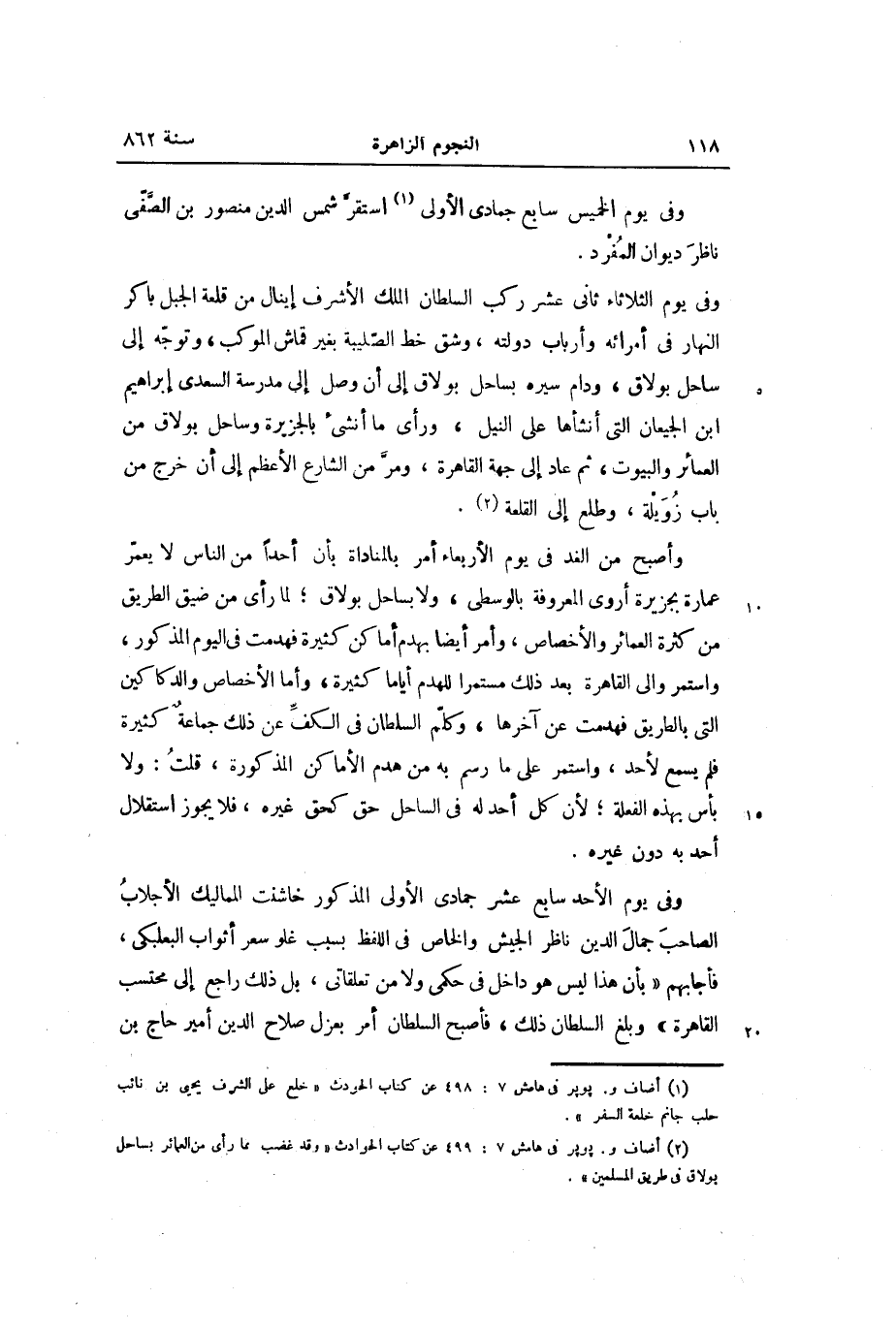 وأصبح من الغد في يوم الأربعاء أمر بالمناداة بأن أحدا من الناس لا يعمّر عمارة بجزيرة أروى المعروفة بالوسطى، ولا بساحل بولاق؛ لما رأى من ضيق الطريق من كثرة العمائر والأخصاص، وأمر أيضا بهدم أماكن كثيرة فهدمت في اليوم المذكور، واستمر والى القاهرة بعد ذلك مستمرا للهدم أياما كثيرة، وأما الأخصاص والدكاكين التي بالطريق فهدمت عن آخرها، وكلّم السلطان في الكفّ عن ذلك جماعة كثيرة فلم يسمع لأحد، واستمر على ما رسم به من هدم الأماكن المذكورة، قلت: ولا بأس بهذه الفعلة؛ لأن كل أحد له في الساحل حق كحق غيره، فلا يجوز استقلال أحد به دون غيره.