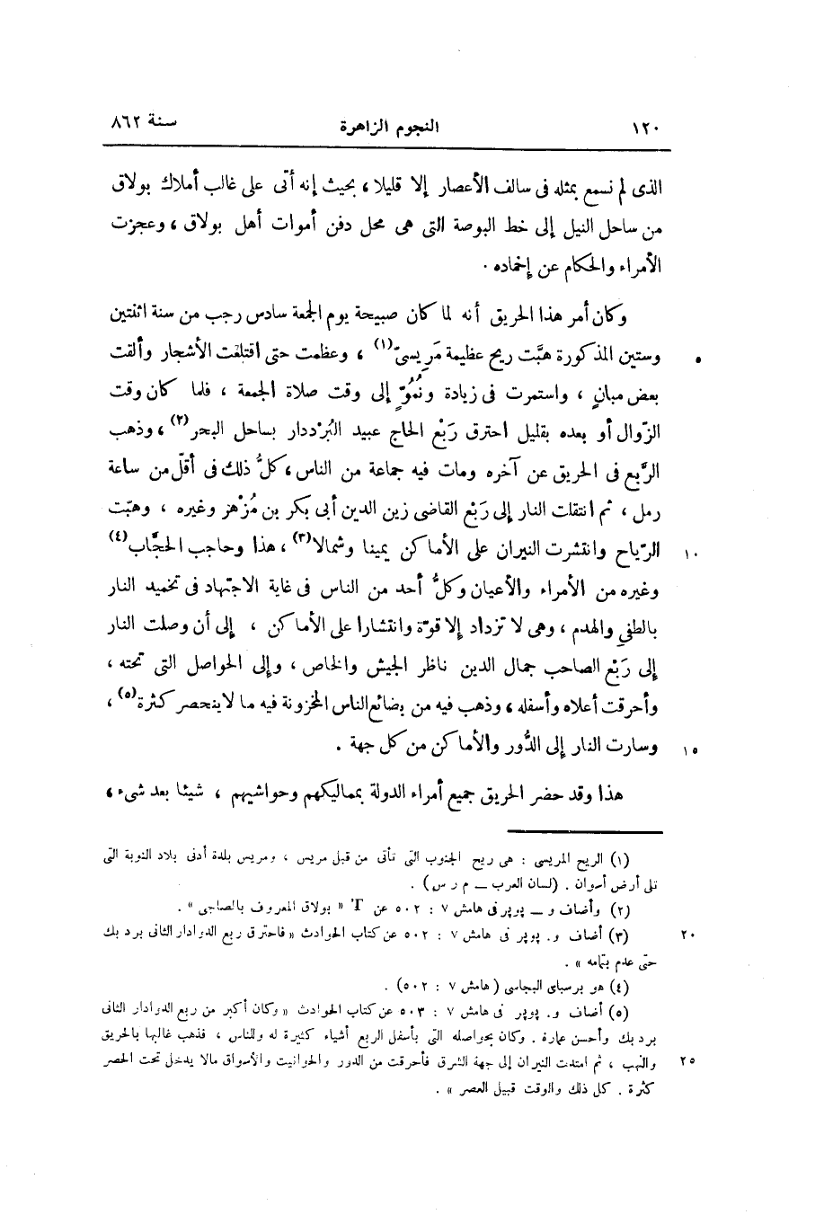 وكان أمر هذا الحريق أنه لما كان صبيحة يوم الجمعة سادس رجب من سنة اثنتين وستين المذكورة هبّت ريح عظيمة مريسىّ «1» ، وعظمت حتى اقتلعت الأشجار وألقت بعض مبان، واستمرت في زيادة ونموّ إلى وقت صلاة الجمعة، فلما كان وقت الزّوال أو بعده بقليل احترق ربع الحاج عبيد البرددار بساحل البحر «2» ، وذهب الرّبع في الحريق عن آخره ومات فيه جماعة من الناس، كلّ ذلك في أقلّ من ساعة رمل، ثم انتقلت النار إلى ربع القاضى زين الدين أبى بكر بن مزهر وغيره، وهبّت الرّياح وانتشرت النيران على الأماكن يمينا وشمالا «3» ، هذا وحاجب الحجّاب «4» وغيره من الأمراء والأعيان وكلّ أحد من الناس في غاية الاجتهاد في تخميد النار بالطفى والهدم، وهى لا تزداد إلا قوّة وانتشارا على الأماكن، إلى أن وصلت النار إلى ربع الصاحب جمال الدين ناظر الجيش والخاص، وإلى الحواصل التي تحته، وأحرقت أعلاه وأسفله، وذهب فيه من بضائع الناس المخزونة فيه ما لا ينحصر كثرة «5» ، وسارت النار إلى الدّور والأماكن من كل جهة.
