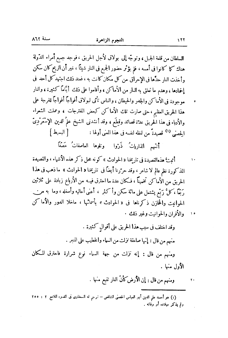 أثبتّ هذه القصيدة في تاريخنا «الحوادث» كونه محل ذكر هذه الأشياء، والقصيدة المذكورة نظم عالم لا شاعر، وقد حرّرنا أيضا في تاريخنا «الحوادث» ما ذهب في هذا الحريق من الأماكن تخمينا، فكان عدة ما احترق فيه من الأرباع زيادة على ثلاثين ربعا، كلّ ربع يشتمل على مائة سكن وأكثر، أعنى أعاليه وأسفله، وما به من الحوانيت والمخازن ذكرناها في «الحوادث» بأسمائها، ماخلا الدور والأماكن والأفران والحوانيت وغير ذلك.