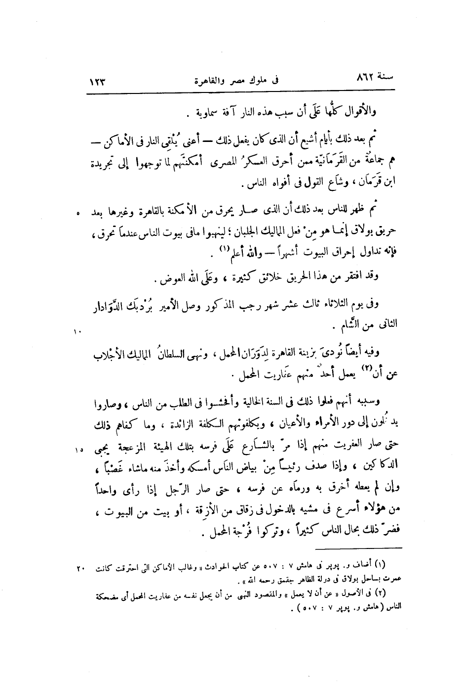 ثم بعد ذلك بأيام أشيع أن الذي كان يفعل ذلك- أعنى يلقى النار في الأماكن- هم جماعة من القرمانيّة ممن أحرق العسكر المصرى أمكنّهم لما توجهوا إلى تجريدة ابن قرمان، وشاع القول في أفواه الناس.