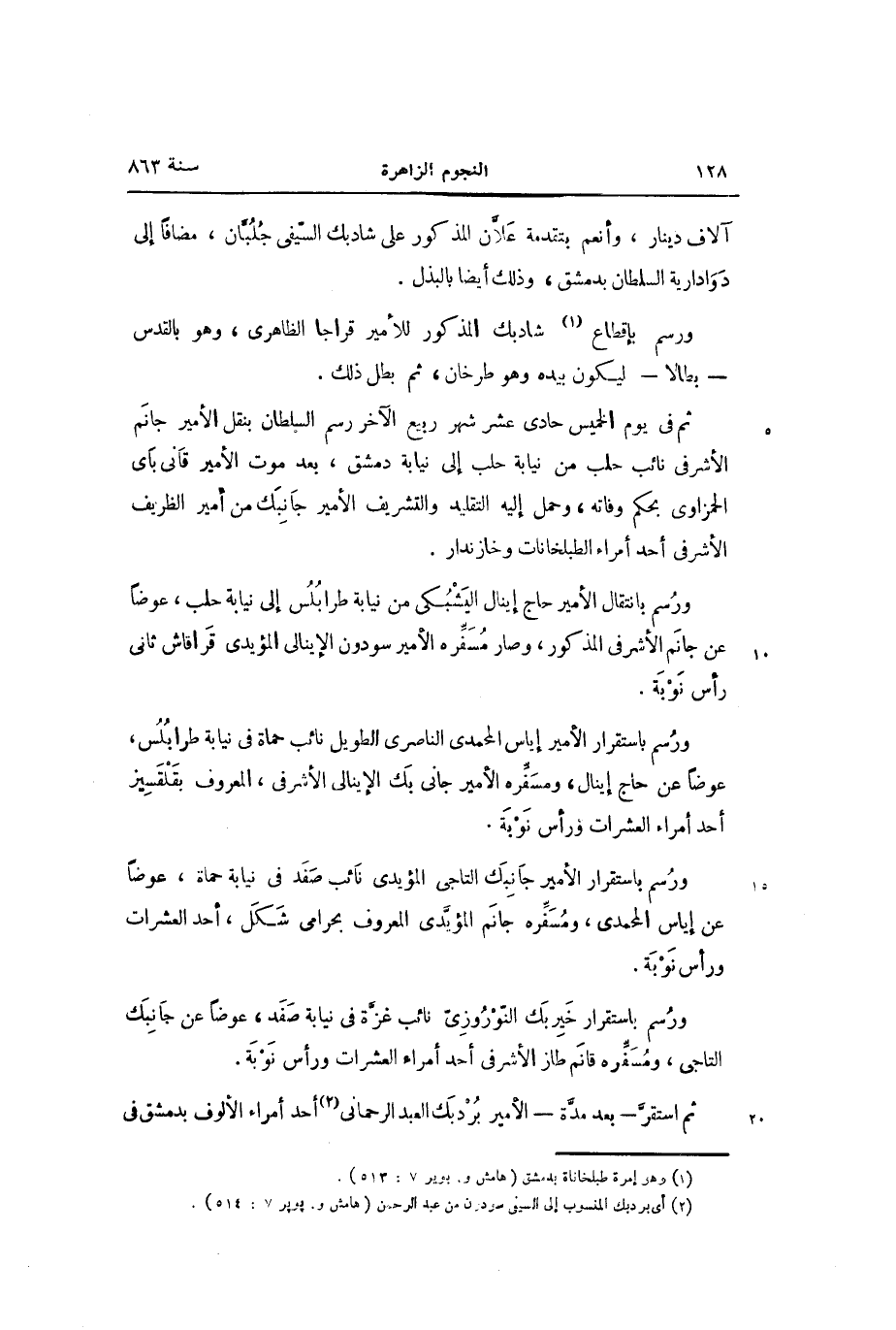 ورسم بانتقال الأمير حاج إينال اليشبكى من نيابة طرابلس إلى نيابة حلب، عوضا عن جانم الأشرفى المذكور، وصار مسفّره الأمير سودون الإينالى المؤيدى قراقاش ثانى رأس نوبة.